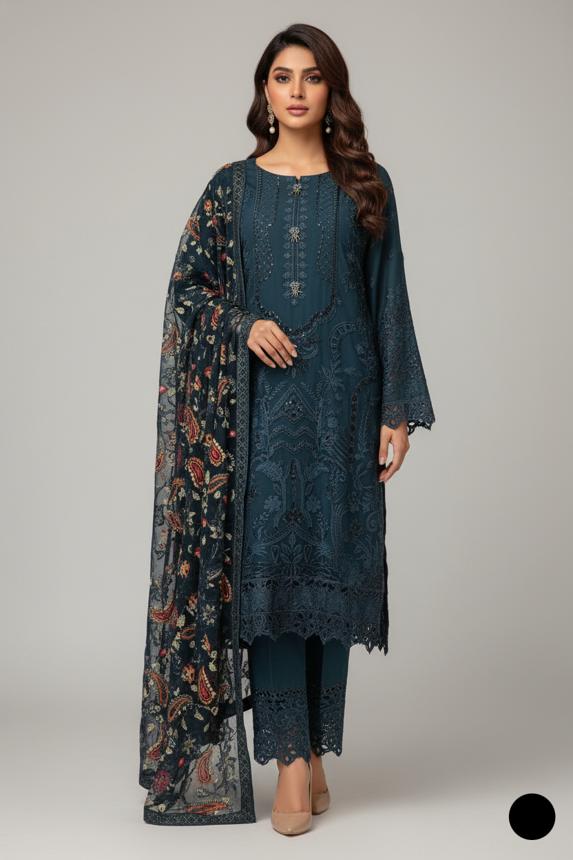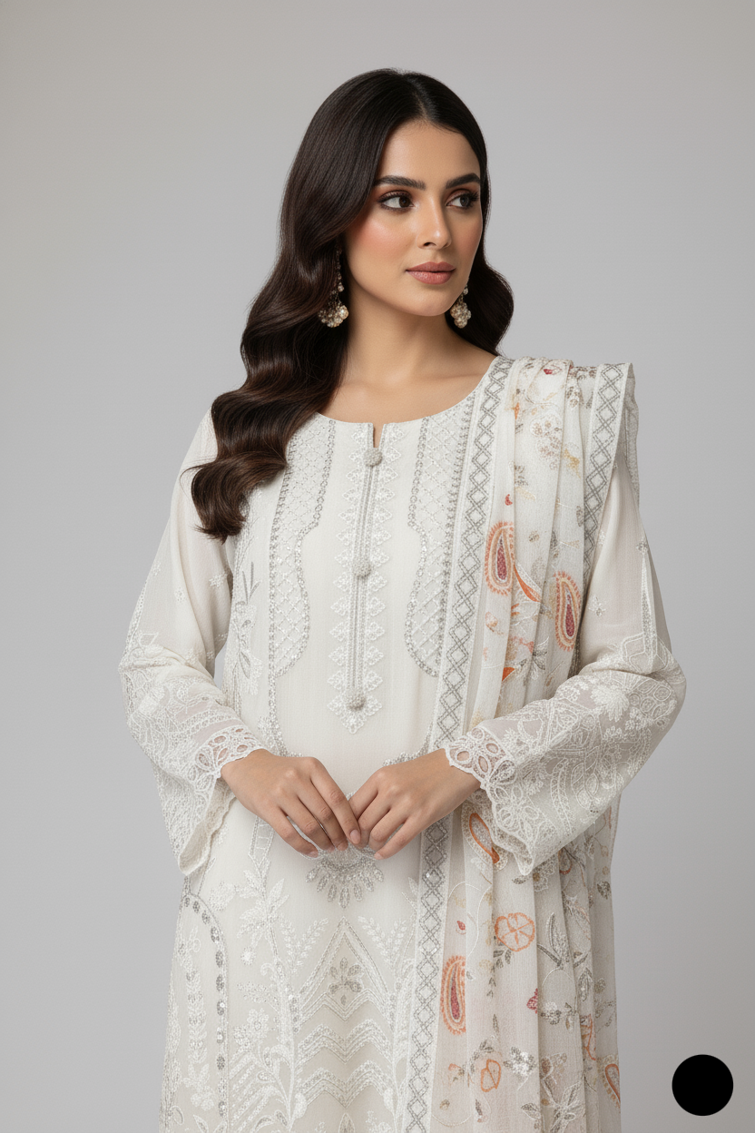 1. This chic ensemble features a straight shirt made from lightweight chiffon fabric, offering a stylish yet comfortable look. The shirt has a length of 39 to 41 inches, providing a flattering fit. It is paired with trousers crafted from grip fabric, ensuring both structure and comfort. The matching chiffon dupatta completes the look, adding a delicate and refined touch. With a total weight of 0.950 kg, this outfit is both light and elegant, making it an ideal choice for semi-formal occasions and casual gatherings