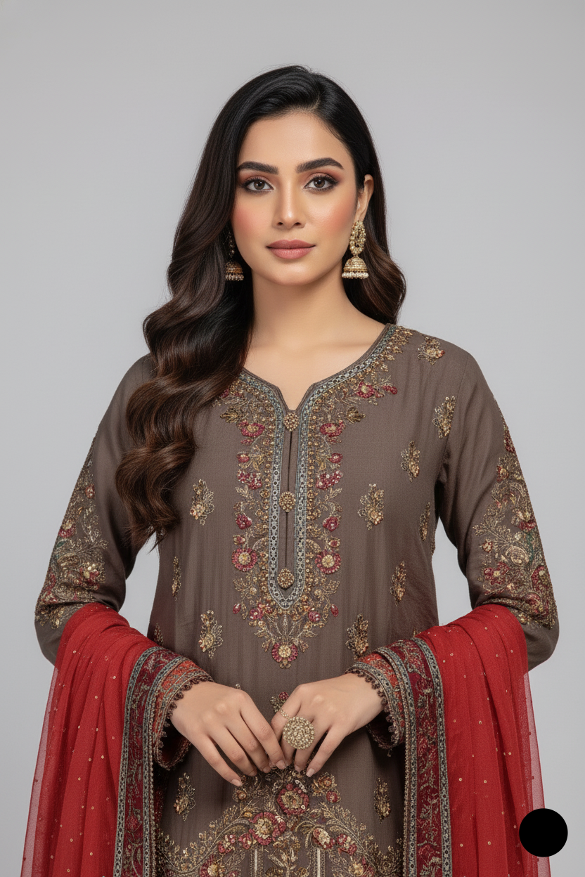- This elegant ensemble features a straight shirt crafted from soft, lightweight chiffon fabric, offering a stylish and comfortable fit. The shirt has a length of 40 to 42 inches, providing a flattering silhouette. It is paired with trousers made from grip fabric, ensuring both structure and ease. The matching chiffon dupatta completes the look, adding a graceful and refined touch. With a total weight of 0.9 kg, this ensemble is lightweight yet chic, making it an ideal choice for both casual and semi-formal occasions.