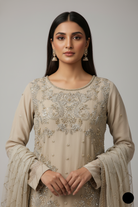 - The outfit features a shirt made from chiffon fabric, paired with sharara trousers also crafted from chiffon fabric, and a dupatta made from chiffon fabric as well. The style of the ensemble is a straight shirt with sharara, offering a traditional yet elegant look. The shirt has a length of 38/40, providing a tailored and comfortable fit. The total weight of the outfit is 1.000 kg, making it lightweight and easy to wear. The combination of soft, flowing chiffon throughout the ensemble creates a harmonious and graceful appearance, perfect for a sophisticated and timeless style.