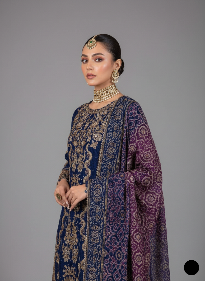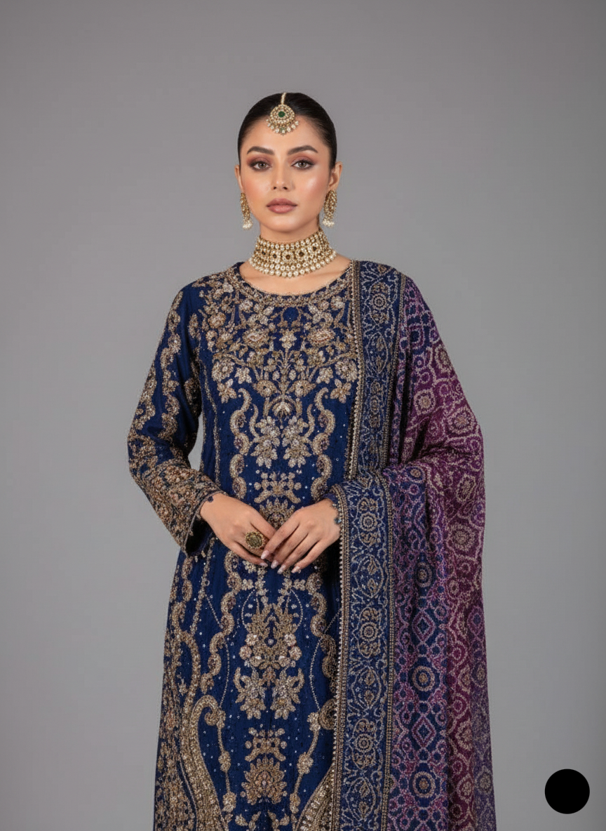 This luxurious 3-piece outfit features a straight shirt made from elegant organza, known for its delicate texture and graceful drape. Paired with a stylish sharara crafted from grip fabric, the outfit offers a balanced mix of structure and flow. The organza dupatta completes the look with its sheer sophistication, adding depth and finesse to the ensemble. With a shirt length of 43 to 45 inches and a total weight of 1.650 KG, this outfit is perfect for weddings, formal events, and festive occasions—bringing together elegance, tradition, and modern flair.