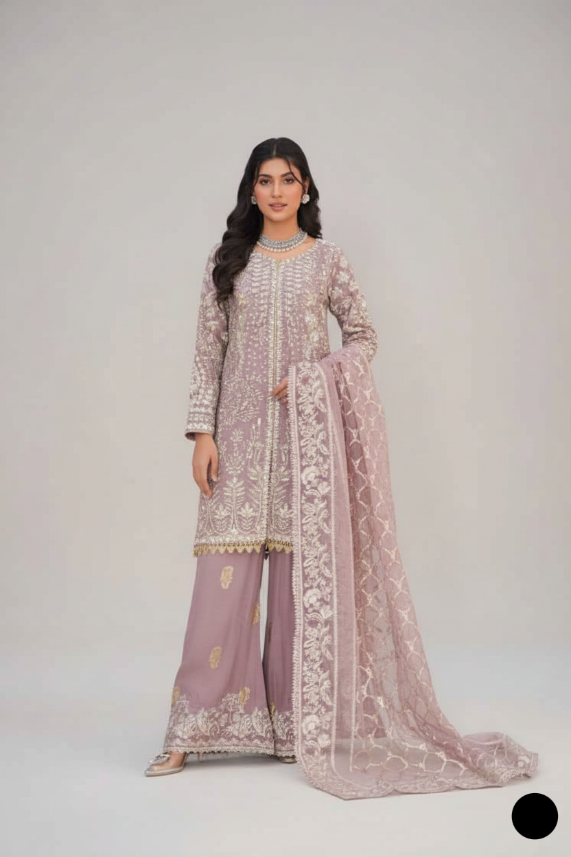 This graceful 3-piece outfit features a net shirt designed in a straight cut style, creating an elegant and contemporary silhouette. Paired with a stylish plazzo made from grip fabric, the ensemble ensures comfort without compromising on style. The look is completed with a flowing organza dupatta, adding a soft and ethereal touch. With a shirt length of 34 to 36 inches and a weight of 1.05 KG, this outfit is ideal for festive occasions, evening events, or formal gatherings, combining lightness with luxurious detailing.