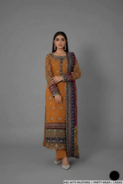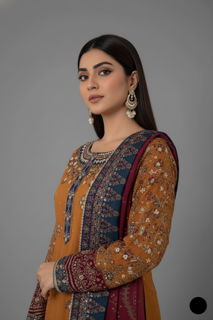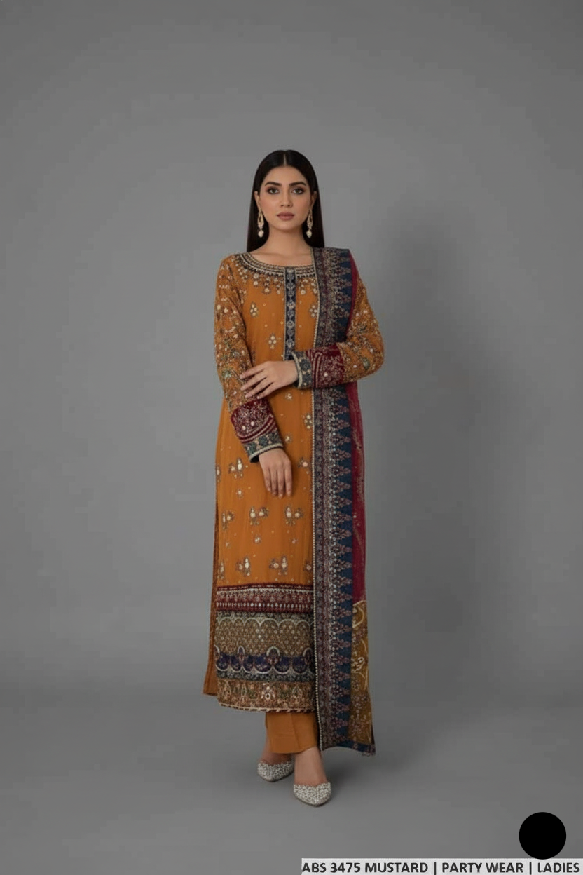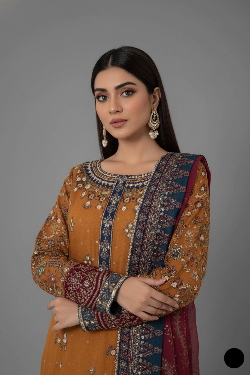 This refined 3-piece outfit features a chiffon straight shirt that flows beautifully, offering a lightweight yet luxurious feel. It’s paired with grip trousers, designed for structure and comfort, providing a balanced silhouette. Completing the look is a delicate organza dupatta, which adds a soft, ethereal touch to the ensemble. With a shirt length of 45 to 47 inches and a total weight of 1.300 KG, this outfit is ideal for formal events, weddings, and festive gatherings, combining modern elegance with traditional charm.