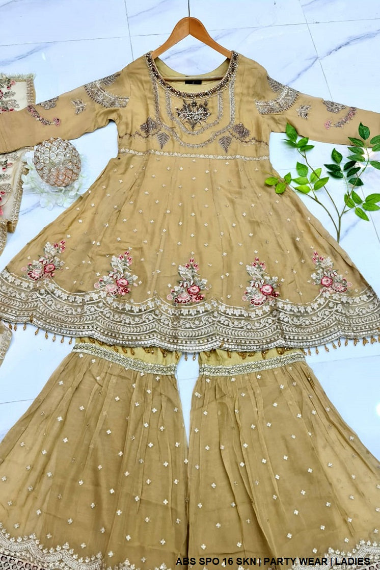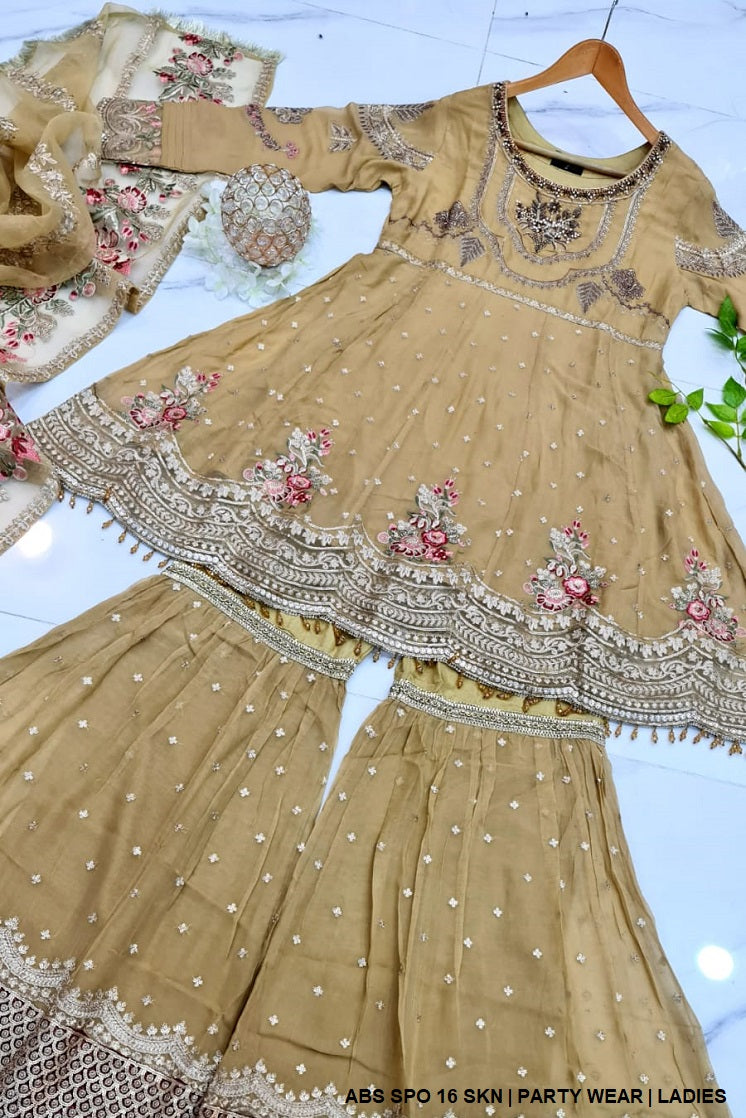 - This exquisite outfit features a chiffon shirt and trousers, offering a light and elegant touch. The dupatta is crafted from organza, adding a refined and delicate feel to the ensemble. The style is a beautiful frock paired with a gharara, creating a traditional yet fashionable look that stands out. The shirt length is available in two options, 38 inches and 40 inches, allowing for a customizable fit. Weighing 1.100 kg, this outfit strikes the perfect balance between comfort and style, making it an ideal choice for special occasions or formal gatherings.