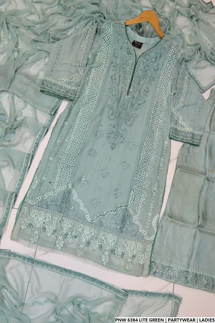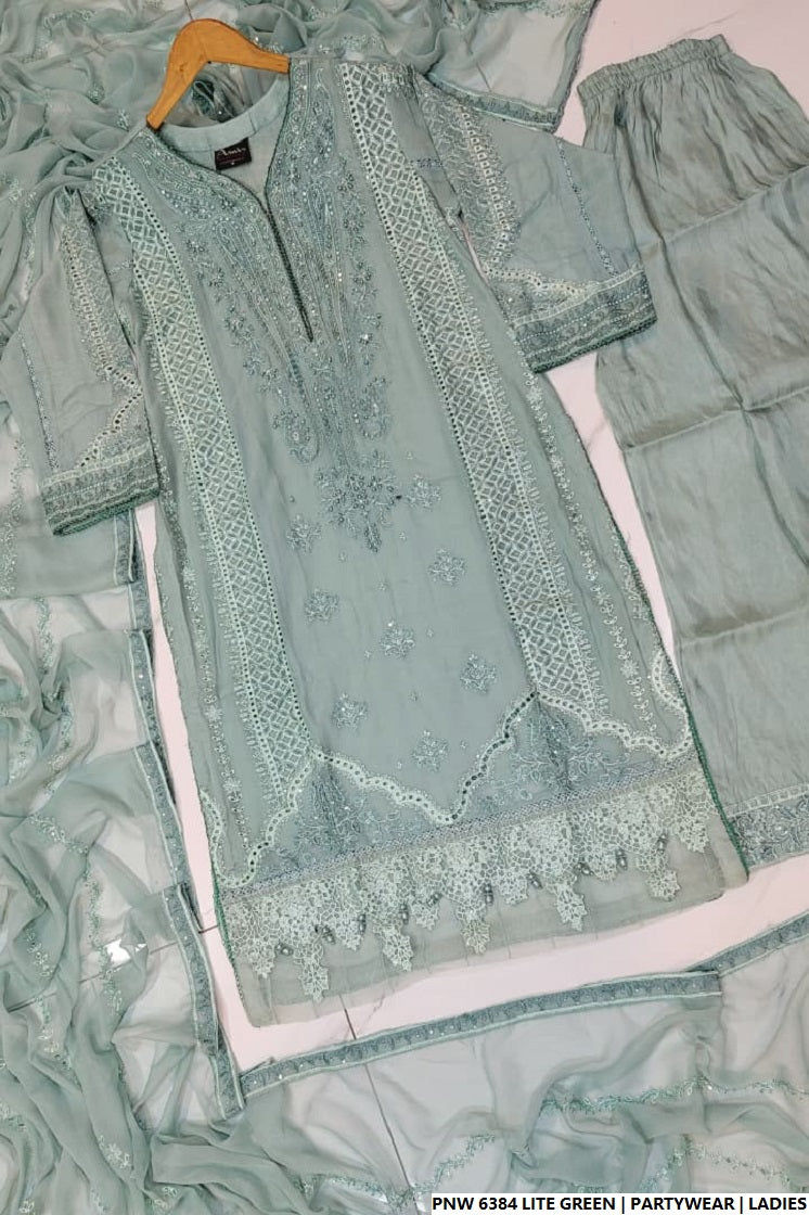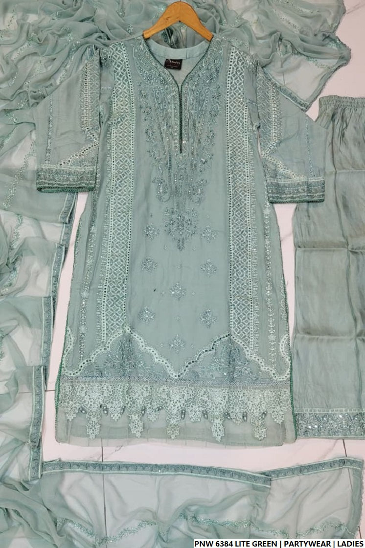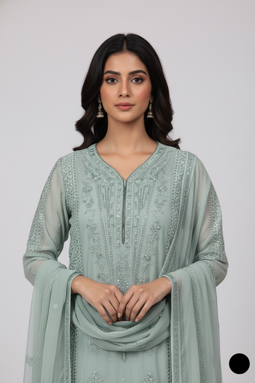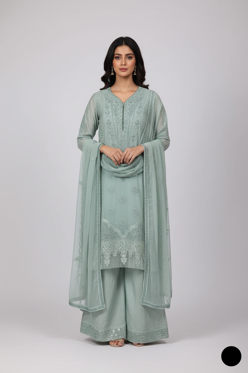 This beautifully crafted outfit features a straight shirt made from premium chiffon, paired with comfortable grip fabric plazo trousers and a matching chiffon dupatta. The shirt length ranges from 45 to 47 inches, offering a long, elegant silhouette that adds grace and sophistication to your look. With a total weight of 0.800 kg, the outfit is slightly heavier, giving it a luxurious feel—perfect for formal events, festive occasions, or evening gatherings.