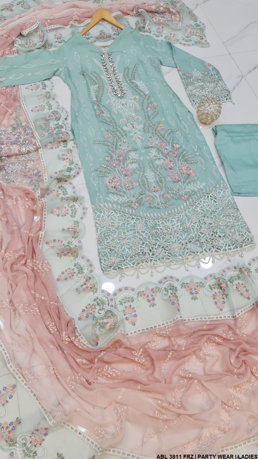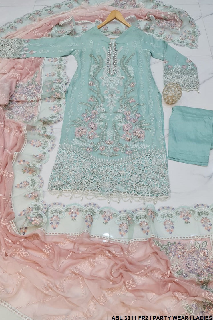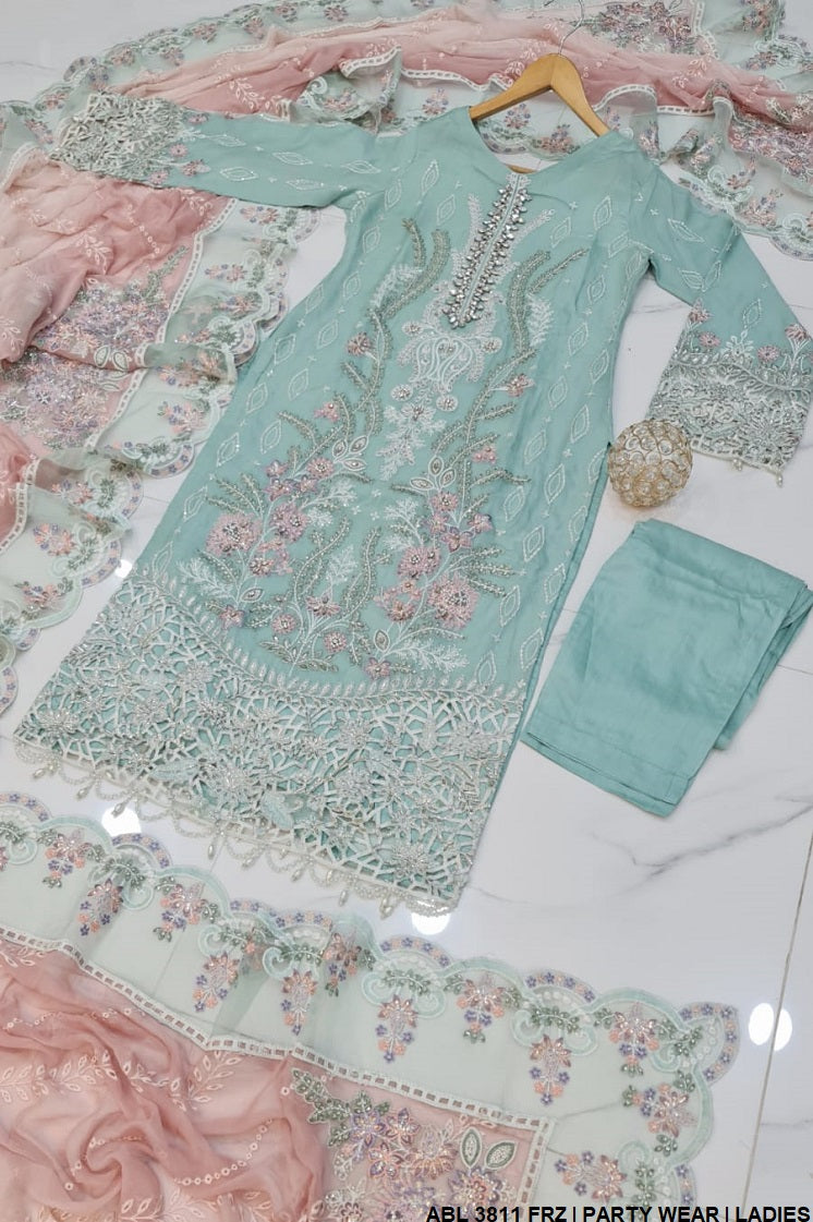 1. This elegant ensemble features a straight shirt crafted from chiffon fabric, offering a soft and flowy drape. The trouser is made from viscose fabric, ensuring a comfortable and smooth fit. Completing the look is a matching chiffon dupatta, adding a touch of sophistication and grace. The shirt length ranges from 47 to 49 inches, creating a refined and elongated silhouette. With a total weight of approximately 1.150 kg, this outfit is both lightweight and stylish, making it a perfect choice for any occasion.