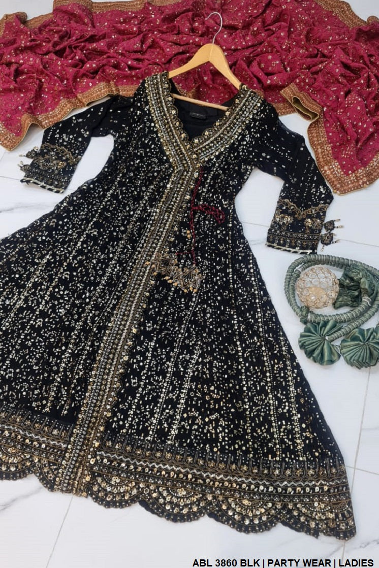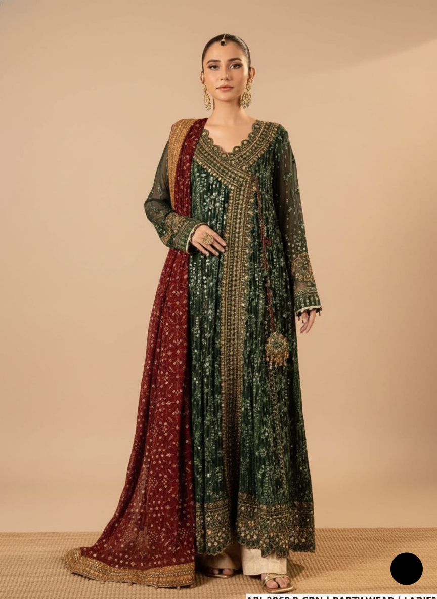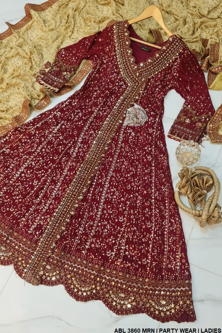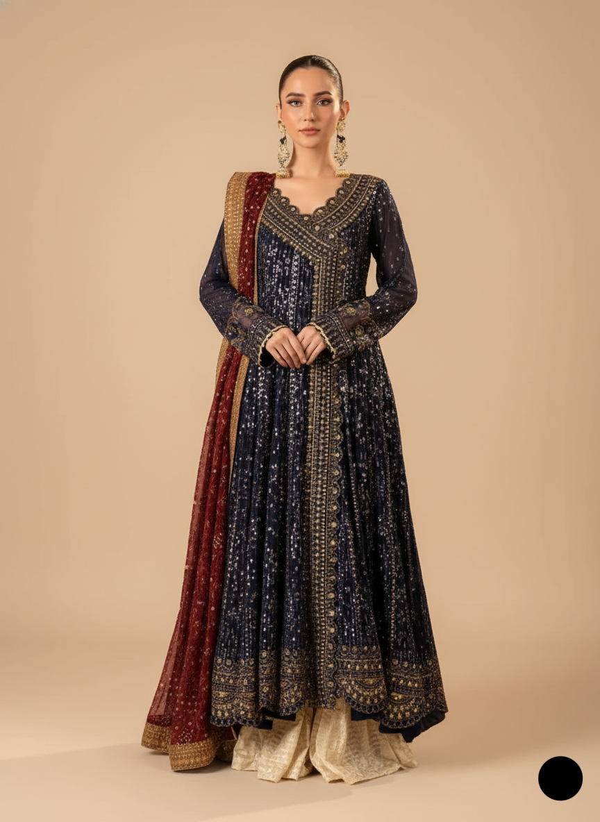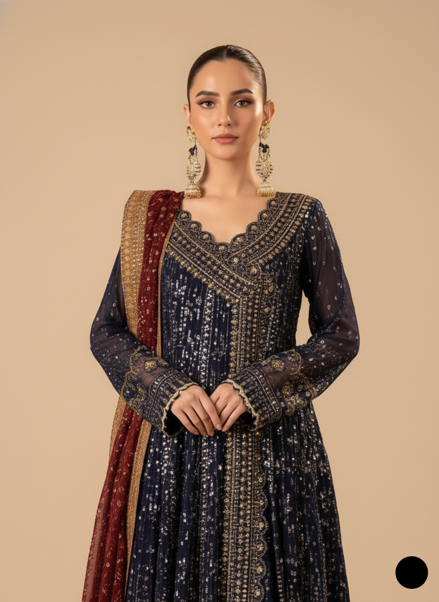 Step into timeless elegance with this Angrakha Style Frock ensemble. Crafted with a flowing Chiffon shirt, paired with soft Masuri trousers, and completed with a stunning Heavy Embroidered Dupatta, this outfit is designed to make a statement. The shirt features a graceful 50 to 52-inch length, creating a flattering silhouette for special occasions. Weighing 1.700 kg, it offers both style and comfort for formal events or festive gatherings.