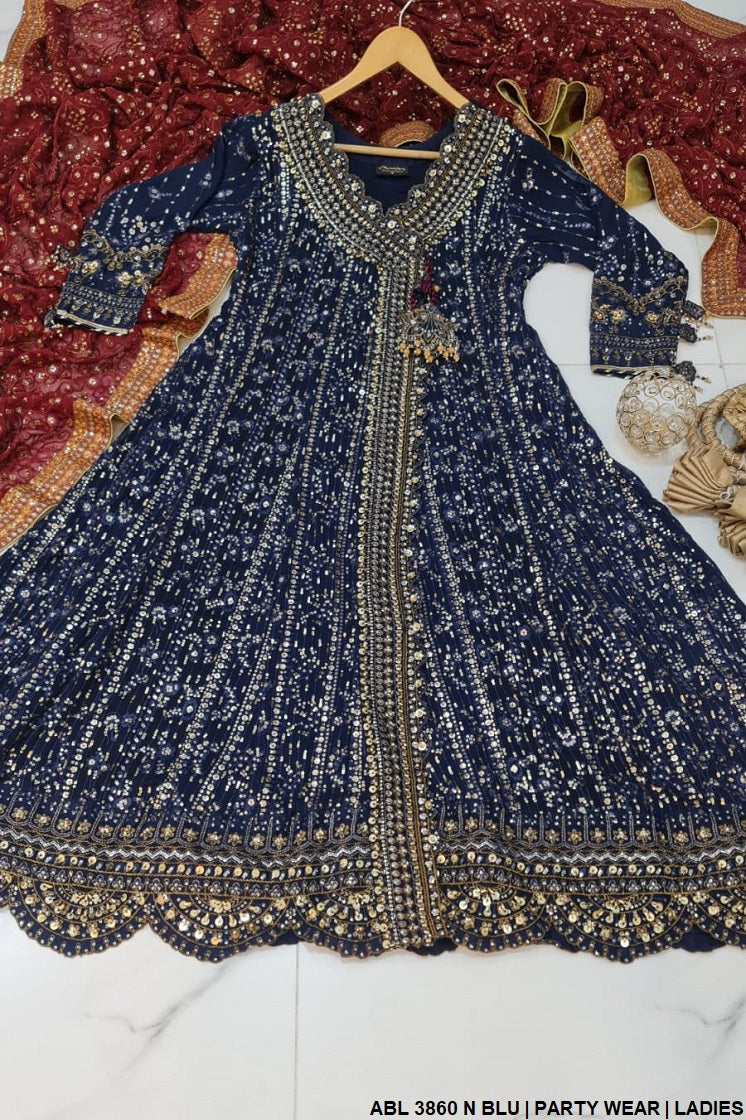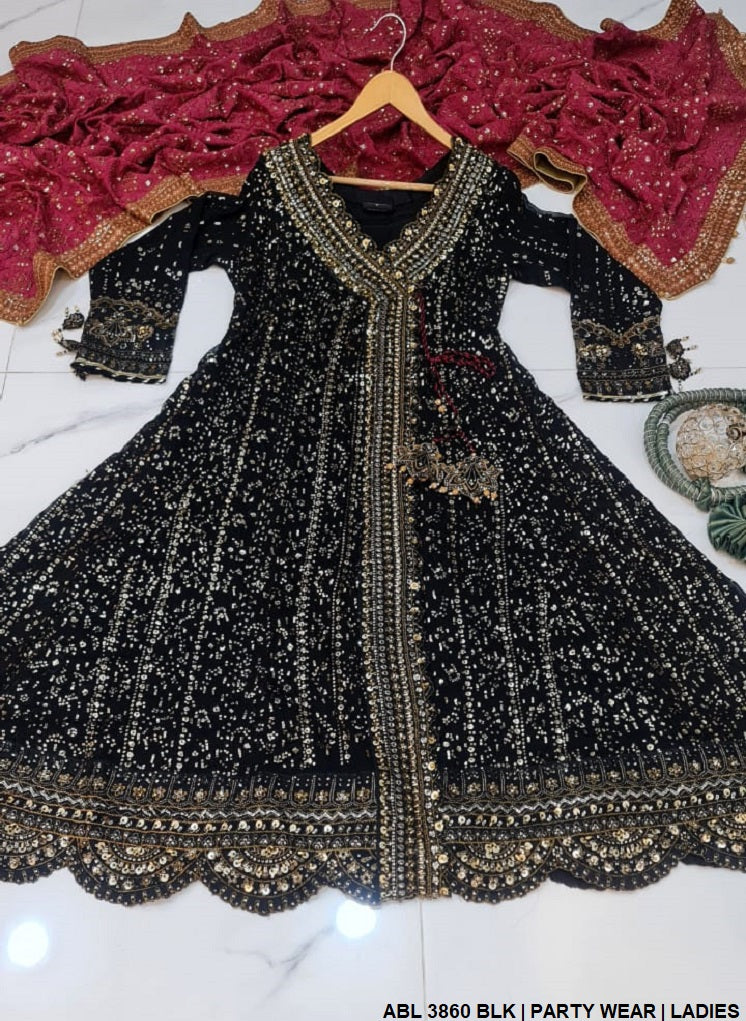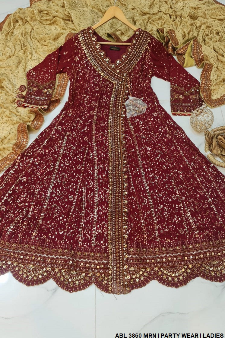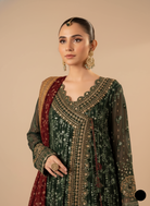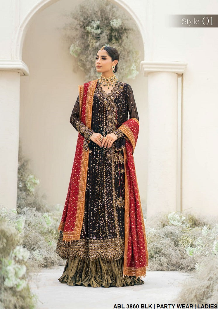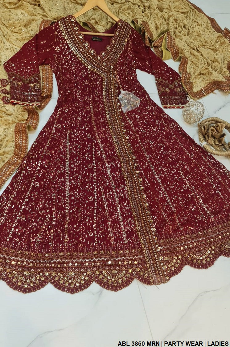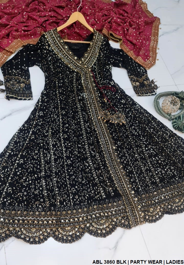 Step into timeless elegance with this Angrakha Style Frock ensemble. Crafted with a flowing Chiffon shirt, paired with soft Masuri trousers, and completed with a stunning Heavy Embroidered Dupatta, this outfit is designed to make a statement. The shirt features a graceful 50 to 52-inch length, creating a flattering silhouette for special occasions. Weighing 1.700 kg, it offers both style and comfort for formal events or festive gatherings.