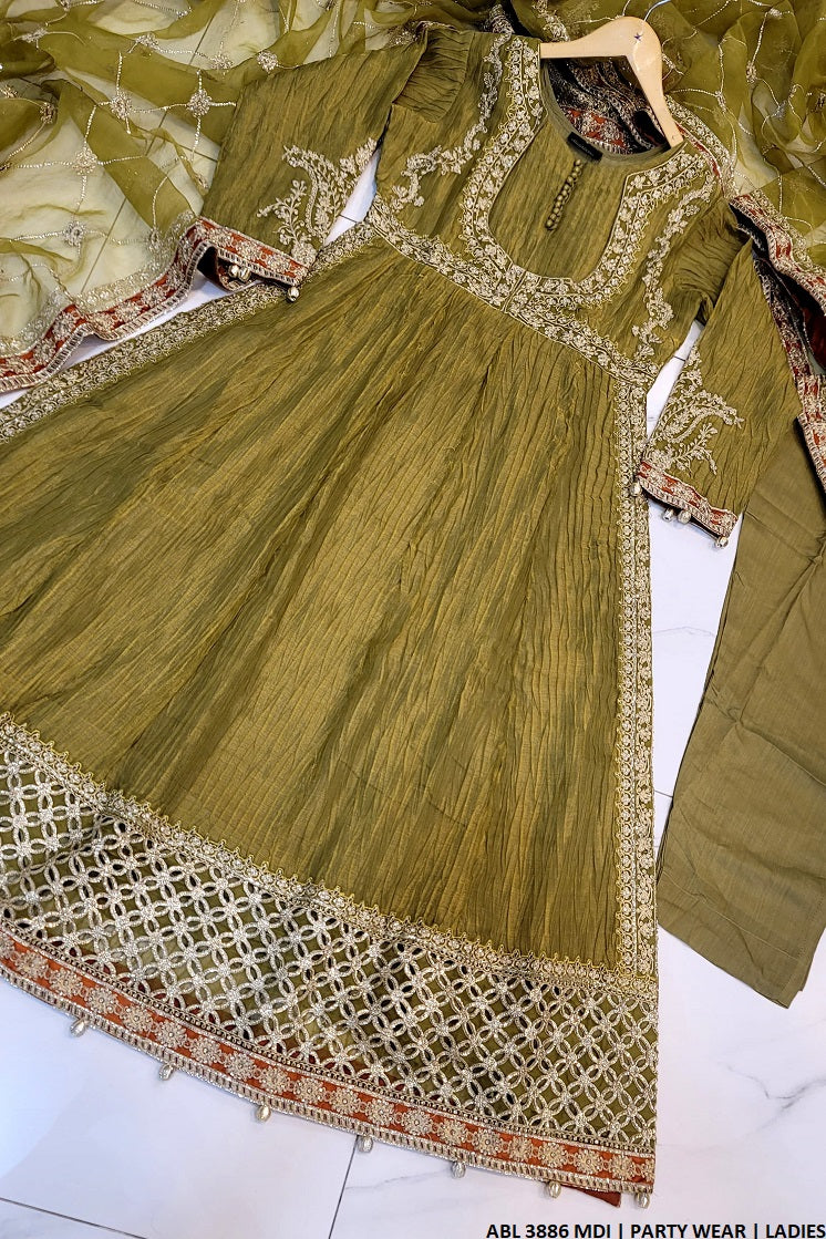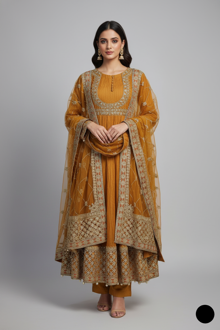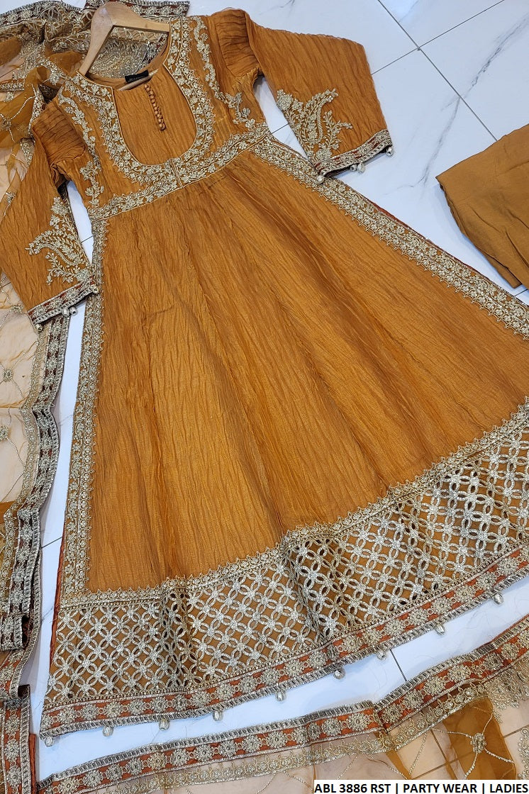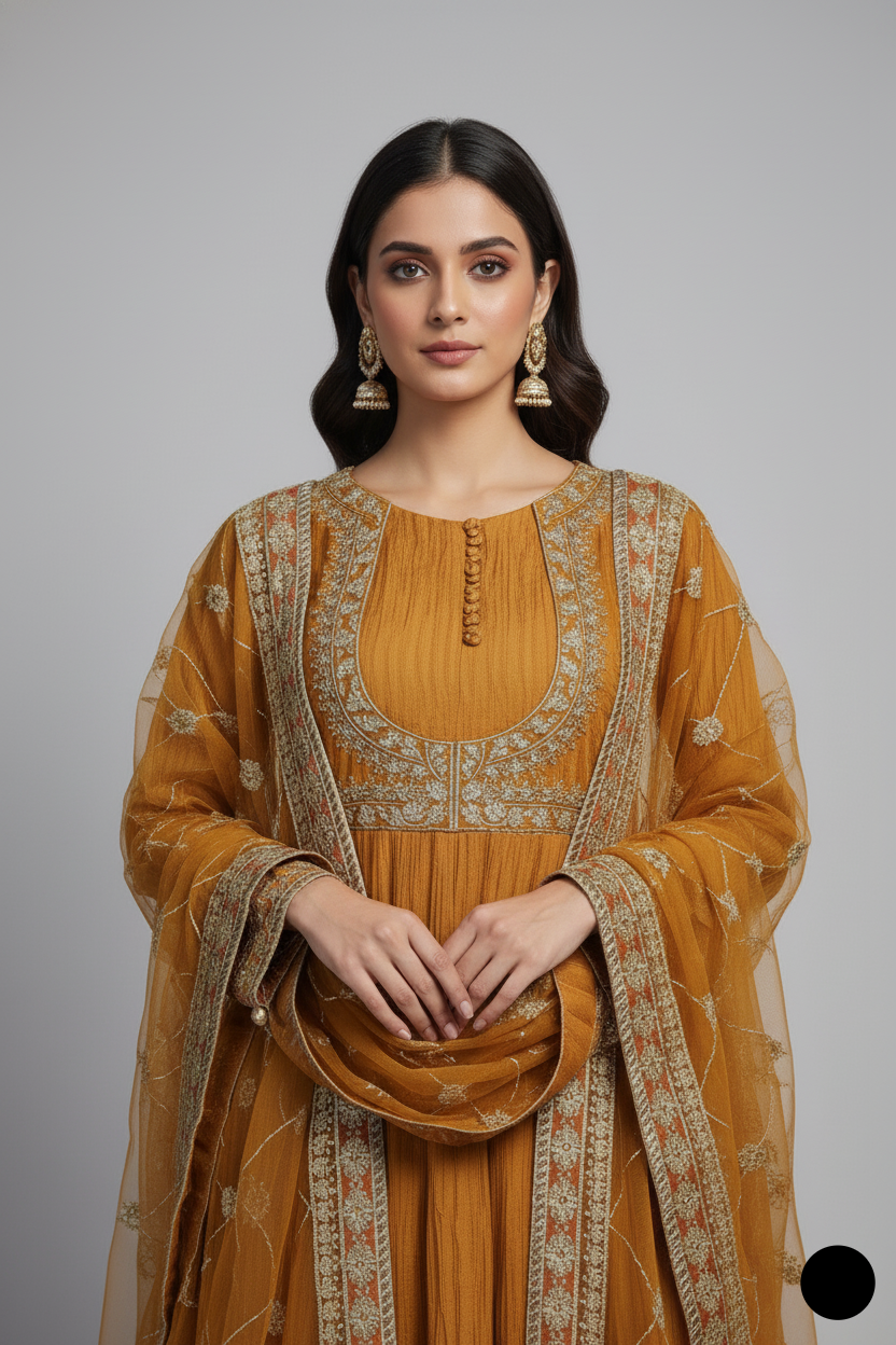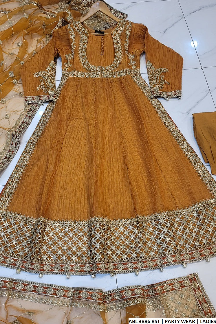 1. This elegant ensemble features a Crush Masuri A-line shirt, designed for a graceful and flowing silhouette with a length ranging from 54 to 56 inches. Paired with viscose trousers, the outfit ensures both comfort and sophistication. The look is completed with a lightweight organza dupatta, adding a delicate and refined touch. Weighing 1.250 kg, this ensemble is perfect for formal and festive occasions, exuding timeless elegance and charm.
