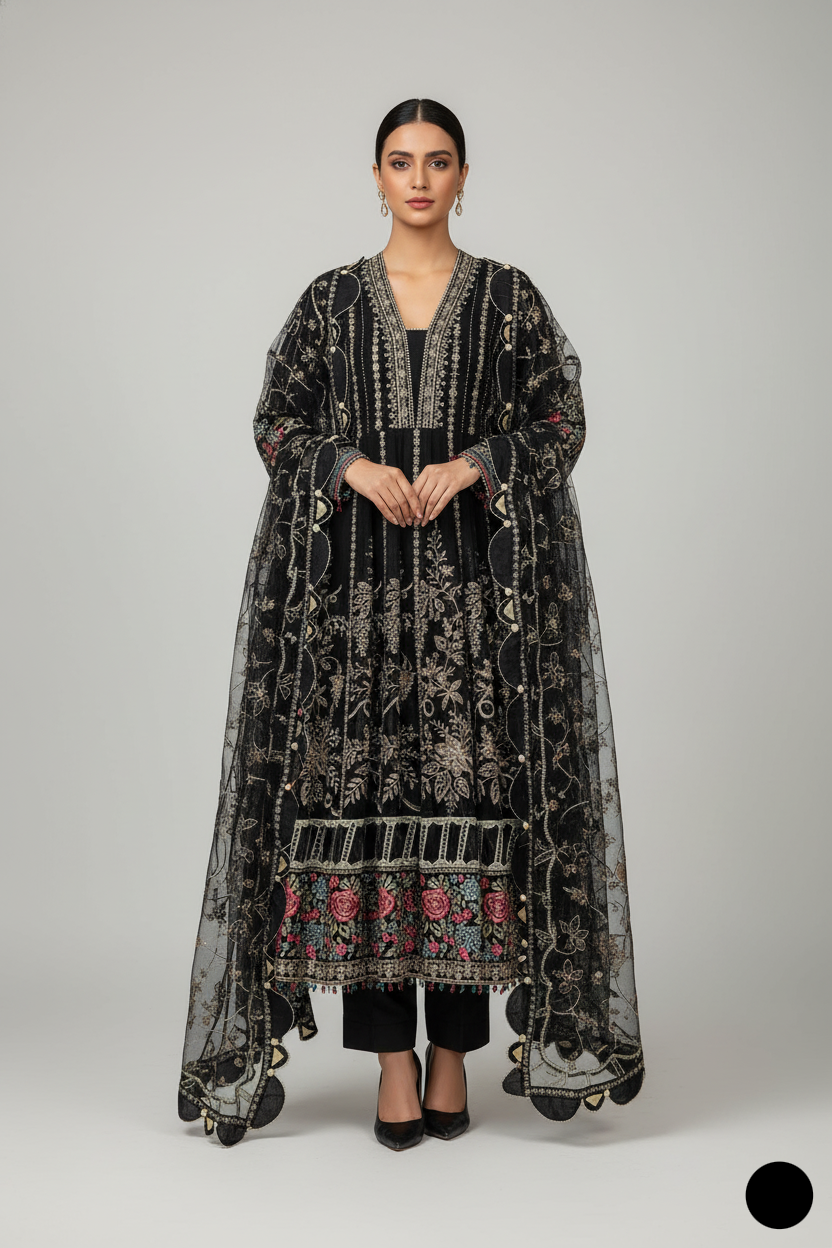 This stunning ensemble features a Khaadi Net fabric shirt paired with Viscose trousers, offering a perfect balance of elegance and comfort. The look is beautifully complemented by a delicate Organza dupatta, adding a touch of sophistication. Designed in a Long Frock style, the shirt length ranges between 55 to 57 inches, creating a regal and graceful silhouette. With a total weight of 1.650 KG, this outfit is both lightweight and stylish, making it an excellent choice for special occasions.