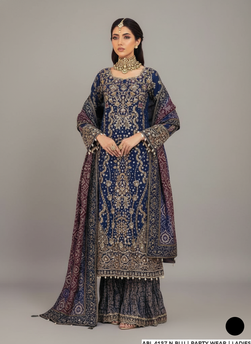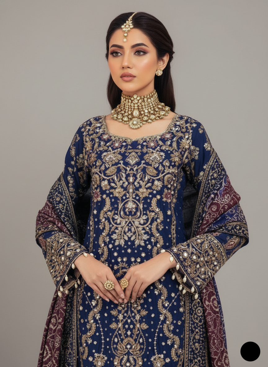 This elegant ensemble features a luxurious Grip fabric shirt, paired with intricately designed Jamawar trousers for a refined and sophisticated look. The outfit is completed with a fully embroidered dupatta, adding intricate detailing and a touch of grandeur. Designed in a Straight Shirt with Plazo style, the shirt length ranges from 45 to 47 inches, ensuring a graceful and flattering silhouette. Weighing 2.050 kg, this ensemble combines elegance and comfort, making it the perfect choice for special occasions, weddings, or formal events.