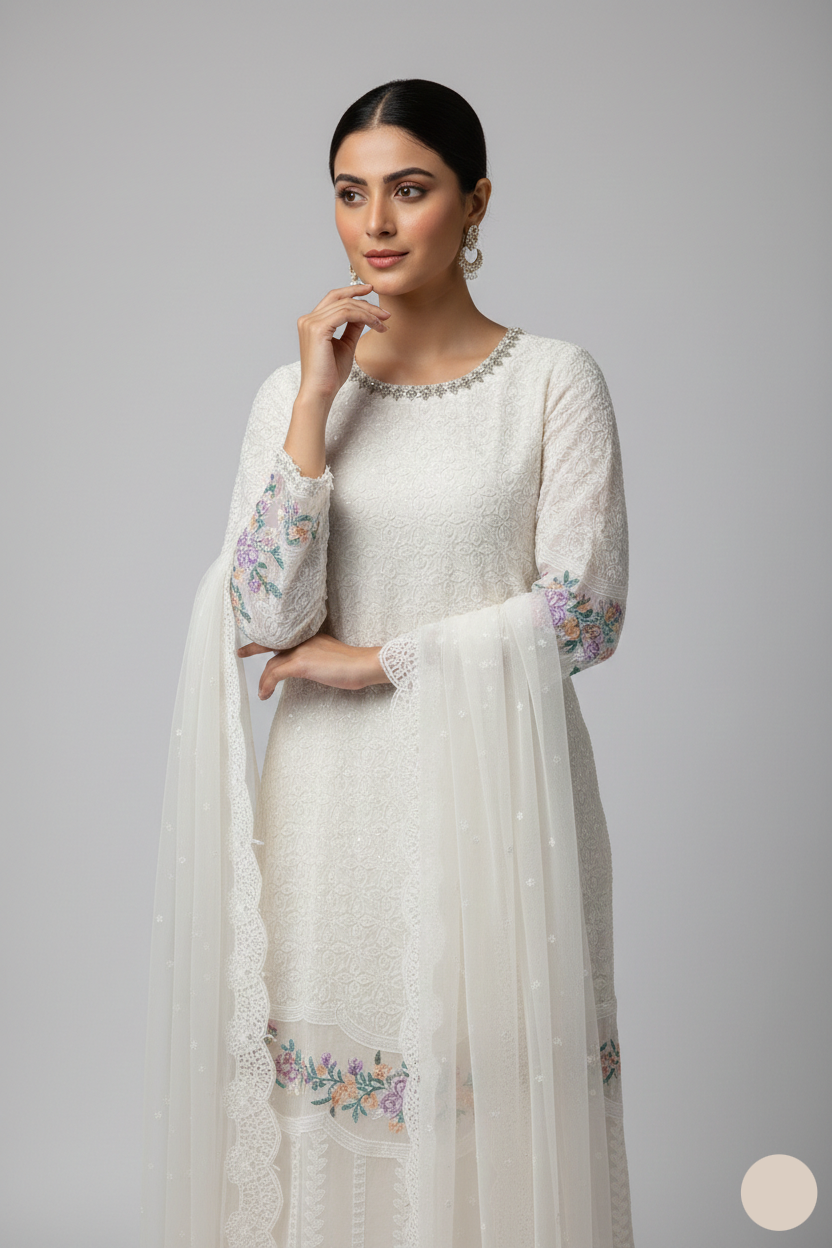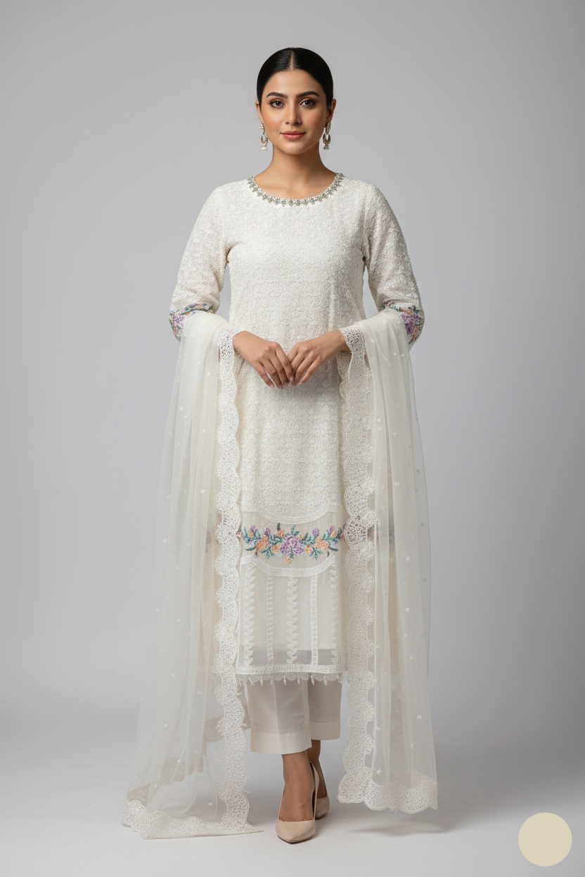This sophisticated ensemble showcases a long organza shirt that flows gracefully with every step, paired with comfortable viscose trousers. The shirt's extended length of 50 to 52 inches adds a touch of elegance, while the matching organza dupatta enhances the outfit’s refined look. Weighing 1.100 kg, this outfit offers a balance of style and structure—perfect for formal gatherings or festive occasions.