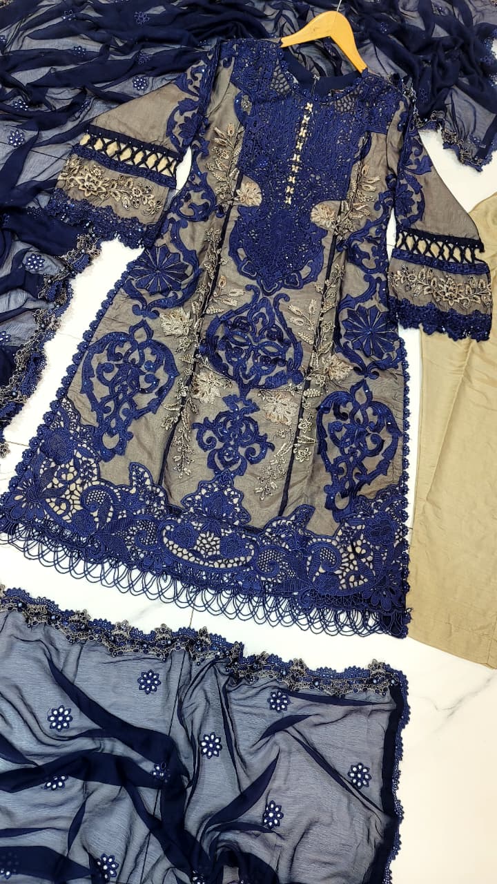 This sophisticated ensemble features a straight shirt crafted from elegant organza, giving it a refined and graceful appearance. With a shirt length of 46 to 48 inches, it offers a modest yet stylish fit suitable for formal and festive occasions. The trousers are made from luxurious kattan silk, adding a rich texture and comfortable wear. The outfit is completed with a soft chiffon dupatta that adds a touch of flowy elegance. Weighing 1.150 kg, this outfit is a perfect choice for anyone looking to combine tradition with modern grace.
