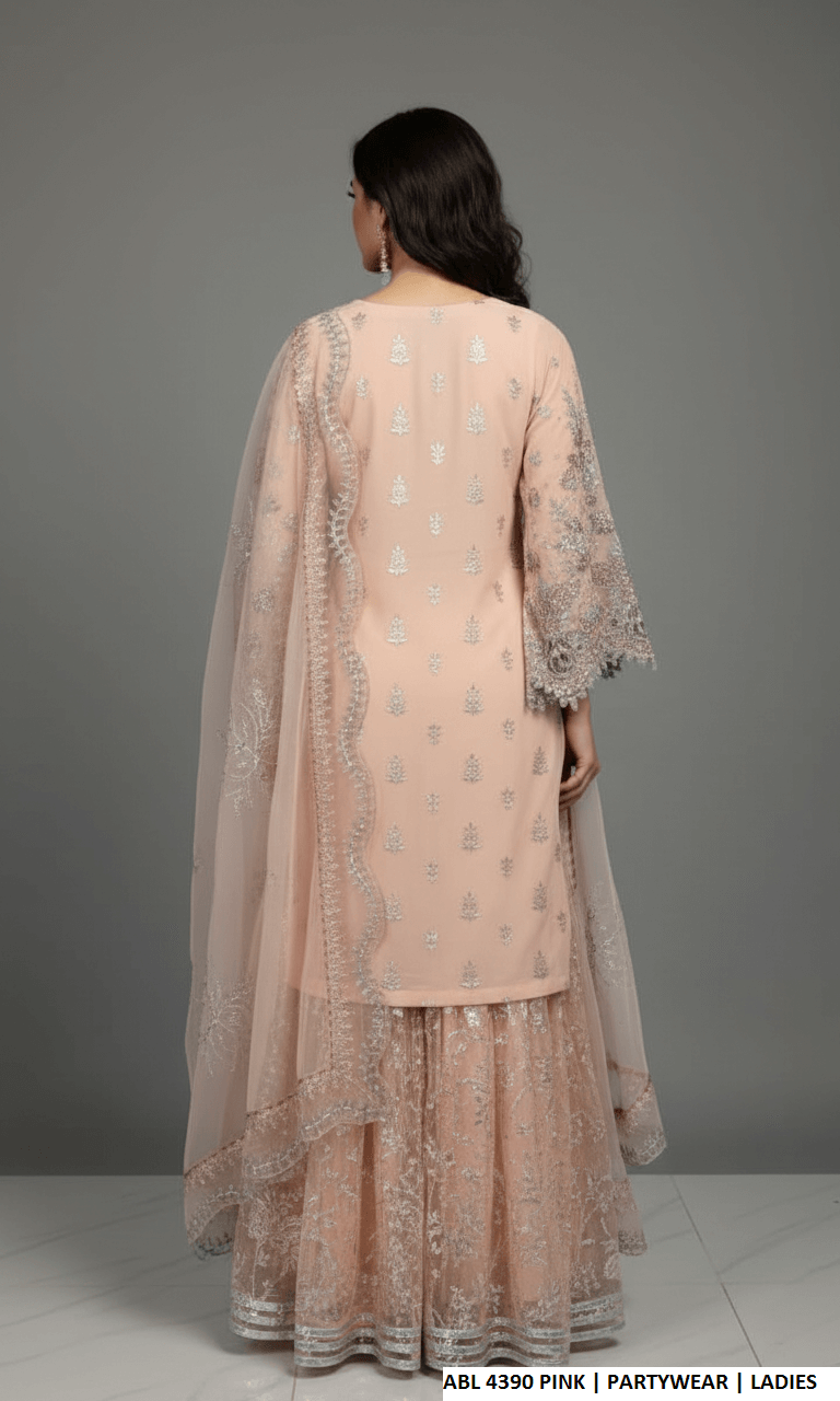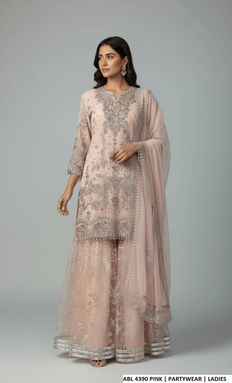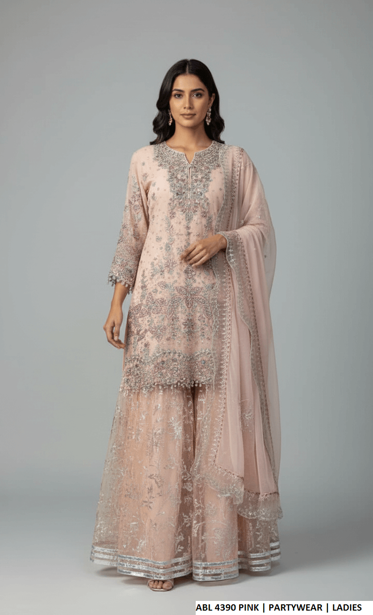 This elegant ensemble features a chiffon shirt styled with a traditional gharara, creating a graceful and festive look. The organza fabric used for the gharara adds volume and structure, while the chiffon dupatta enhances the outfit with a soft, flowy finish. The shirt length ranges from 37 to 39 inches, offering a balanced and flattering silhouette. The complete outfit has an approximate weight of 1.350 kg.