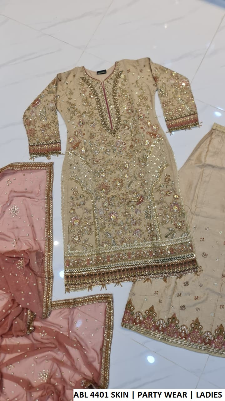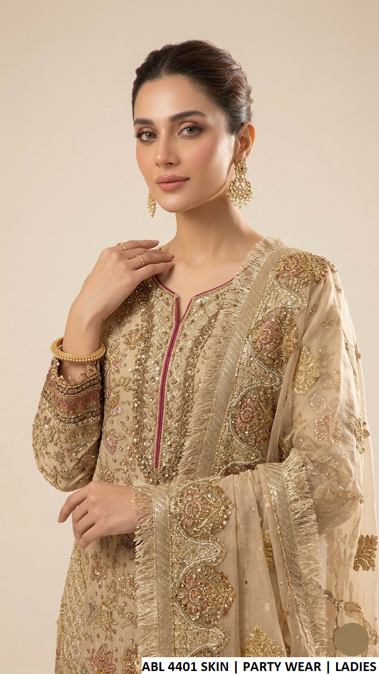 This beautiful 4-piece suit is designed to give a graceful and elegant look. The shirt is crafted from premium Masoori Net fabric, paired with a comfortable viscose trouser for a smooth and breathable feel. The outfit comes with two stylish dupattas, one made from lightweight chiffon and the other from soft net, adding versatility and charm to the overall appearance. Designed in a straight shirt style with a trendy plazo, the shirt length is approximately 43/45 inches, making it a perfect choice for festive, formal, or special occasions. The total outfit weight is around 1.550 kg.