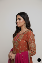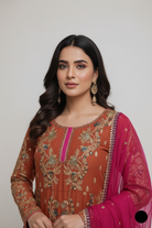 - This elegant outfit features a chic frock with a plaza style, crafted from luxurious fabrics for a sophisticated look. The shirt is made from delicate chiffon, offering a lightweight and flowy feel, while the trousers are designed with grip fabric for a comfortable and secure fit. Adding a touch of glamour, the dupatta is crafted from zari organza, exuding a subtle shimmer and elegance. The shirt length measures 38/40, ensuring a perfect fit, and the entire ensemble weighs approximately 1.250 kg, making it both stylish and easy to wear. This combination of fabrics and design creates a harmonious blend of comfort and fashion, ideal for any special occasion.
