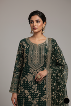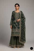 - The outfit features a shirt made from chiffon fabric, paired with gharara trousers crafted from jamawar fabric, and a dupatta also made from chiffon fabric. The style of the ensemble is a straight shirt with gharara, offering a traditional yet elegant look. The shirt has a length of 43/45, providing a tailored and comfortable fit. The total weight of the outfit is 1.400 kg, making it lightweight yet sophisticated. The combination of soft, flowing chiffon and the intricately designed jamawar fabric creates a perfect blend of grace and opulence, ideal for a timeless and regal appearance.