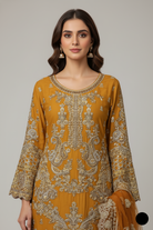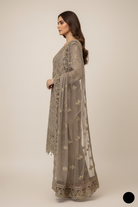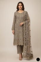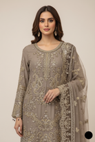 - The outfit features a shirt made from chiffon fabric, paired with trousers crafted from grip fabric, and a dupatta made from net fabric. The style of the ensemble is a straight shirt with plaazo trousers, offering a sleek and modern look. The shirt has a length of 43/45, providing a tailored and comfortable fit. The total weight of the outfit is 1.300 kg, making it lightweight yet elegant. The combination of soft, flowing chiffon, structured grip fabric, and the delicate net dupatta creates a perfect balance of sophistication and contemporary style, ideal for a chic and graceful appearance.