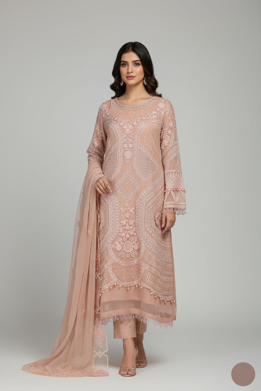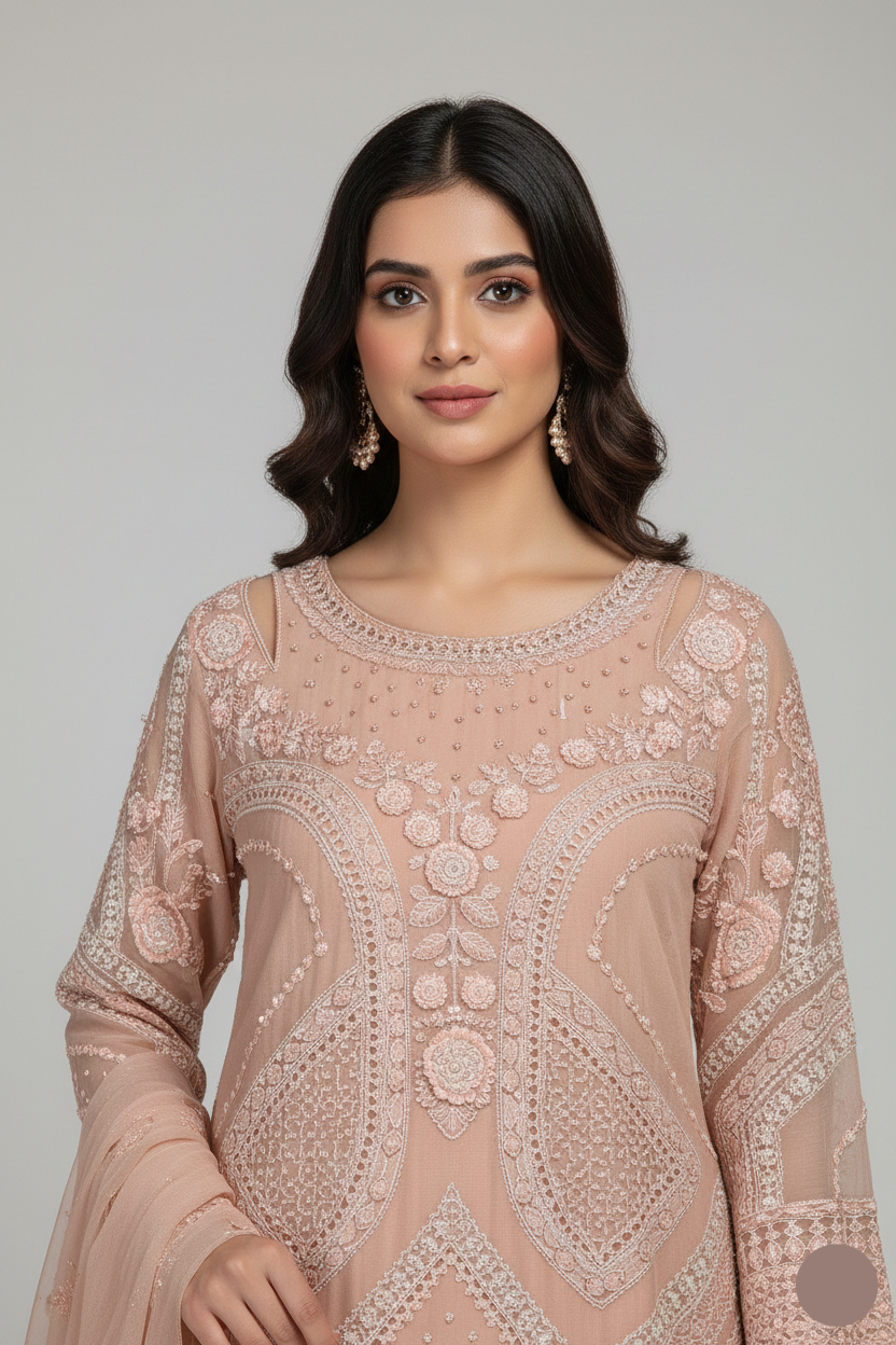 - The outfit features a shirt made from chiffon fabric, paired with trousers crafted from grip fabric, and a dupatta also made from chiffon fabric. The style of the ensemble is an A-line shirt with plaazo trousers, offering a graceful and modern look. The shirt has a length of 43/45, providing a flattering and comfortable fit. The total weight of the outfit is 0.950 kg, making it lightweight and easy to wear. The combination of soft, flowing chiffon and the structured grip fabric creates a harmonious balance of elegance and contemporary style, perfect for a chic and sophisticated appearance.