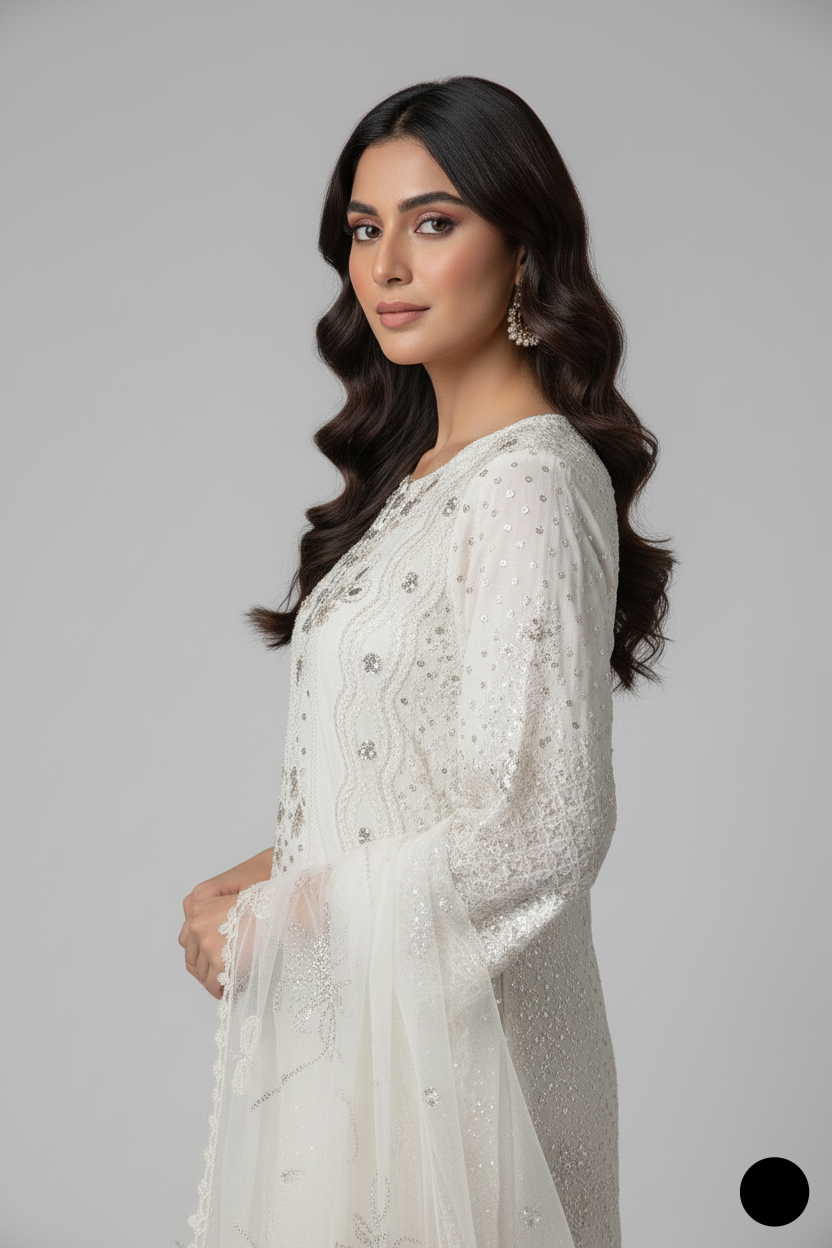 This sophisticated ensemble features a chiffon straight shirt paired with sleek grip trousers, offering a blend of elegance and modernity. The shirt, with a length ranging from 44 to 46 inches, provides a graceful and flattering fit. The trousers complement the flow of the outfit, while the delicate net dupatta adds an airy, refined finish. Weighing 1.200 kg, this outfit offers a perfect balance of style and structure, making it a standout choice for formal gatherings, festive occasions, or elegant evening wear.