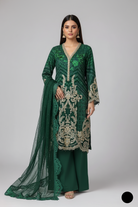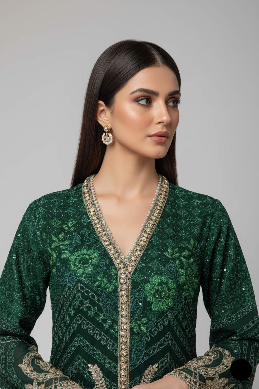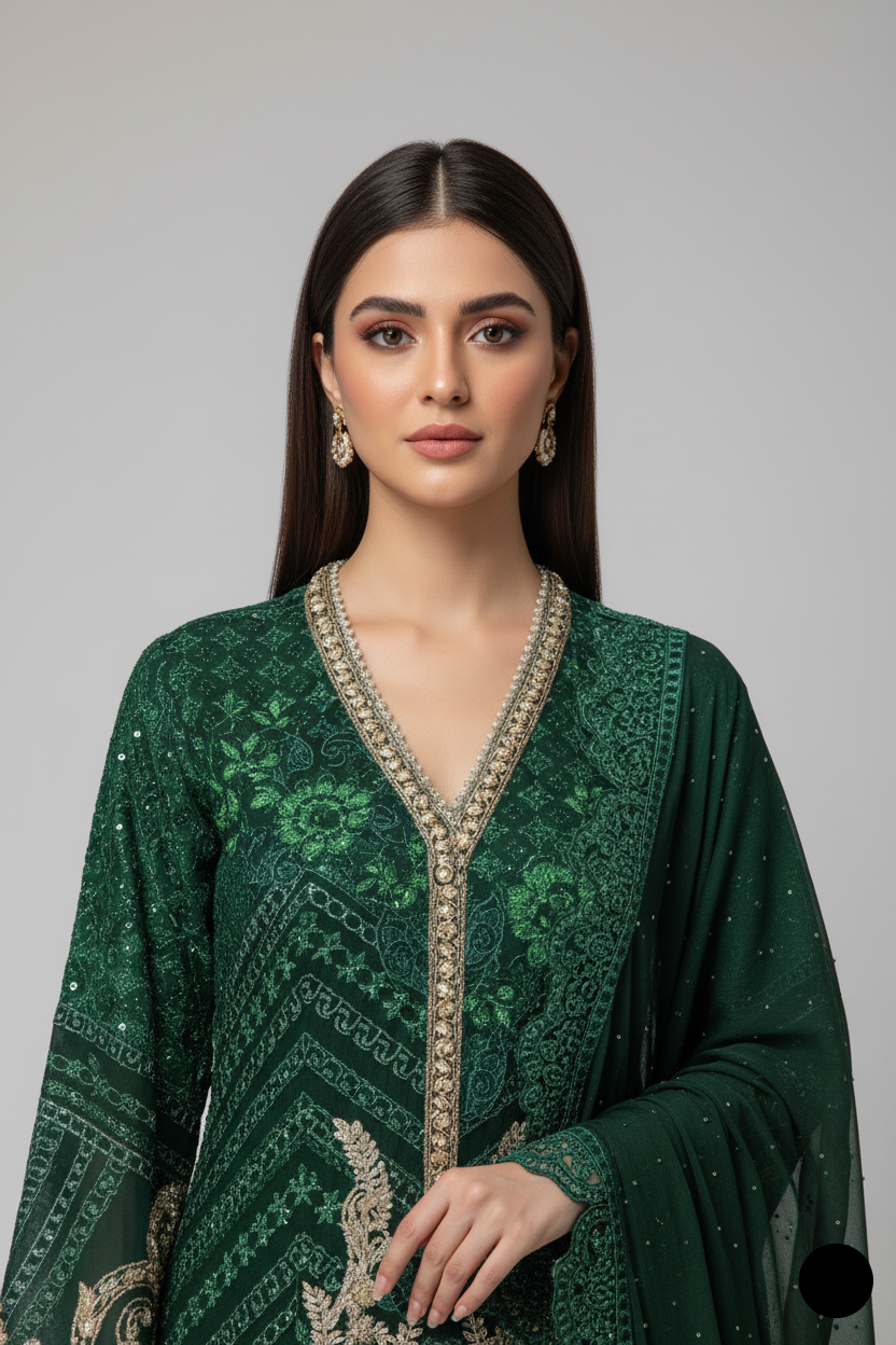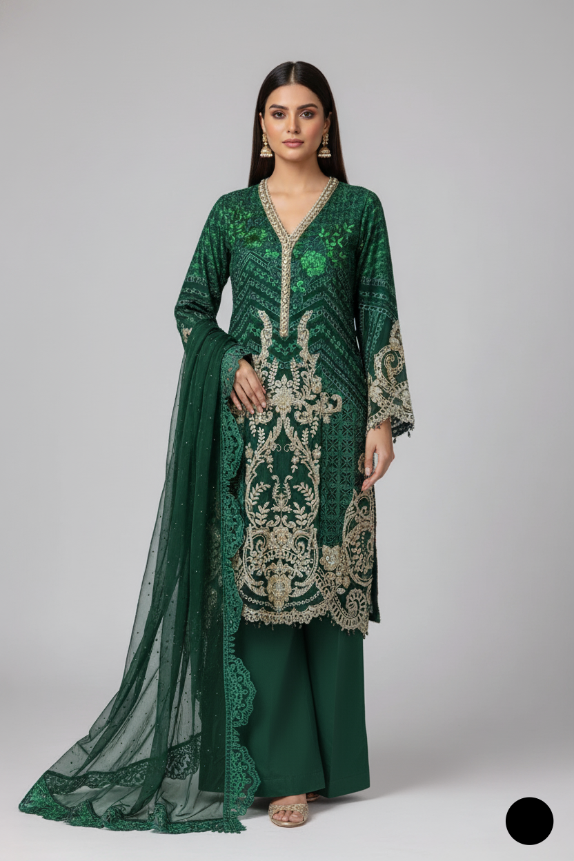This three‑piece suit combines a flowing chiffon A‑line shirt, soft viscose plazo trousers, and a matching chiffon dupatta to create an ensemble that drapes beautifully. Chiffon is prized for its lightweight, breathable and sheer texture, which adds grace and movement to the shirt and dupatta, while viscose brings a silk-like softness and excellent drape to the trousers — an ideal pairing for both comfort and visual elegance. At approximately 1.200 kg, this suit strikes a balance between delicate silhouette and luxurious feel—slightly heavier than standard 3‑piece chiffon sets (which often weigh around 850 g)—providing a bit more substance without compromising on airiness. The A‑line top flares elegantly into a graceful palazzo hemline, making it perfect for formal occasions, weddings, or festive gatherings where you prefer refined modern styling over fitted cuts.