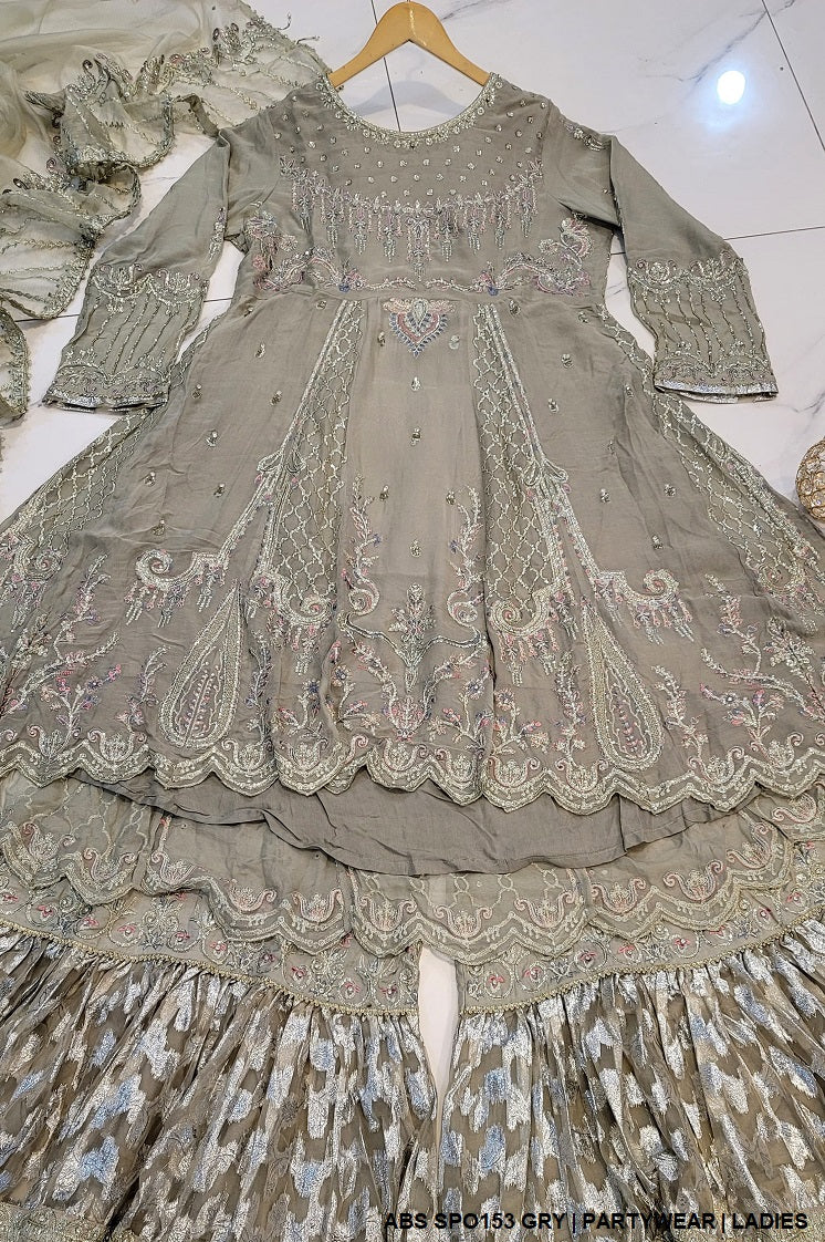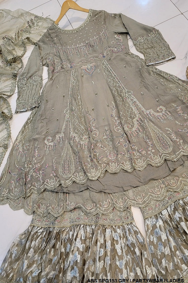 - This exquisite outfit features a chiffon shirt paired with zari organza trousers, combining elegance and luxury. The dupatta is made from masuri net, adding a delicate and refined touch to the ensemble. The style is a tail frock with plazo pants, offering a graceful and contemporary silhouette. The shirt comes in two length options, 42 inches and 49 inches, allowing for a customized fit. Weighing 1.300 kg, this outfit is slightly heavier but still lightweight enough for comfort, making it a perfect choice for formal occasions or special gatherings while maintaining an air of sophistication.