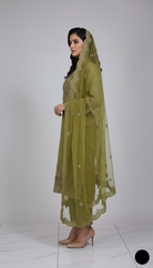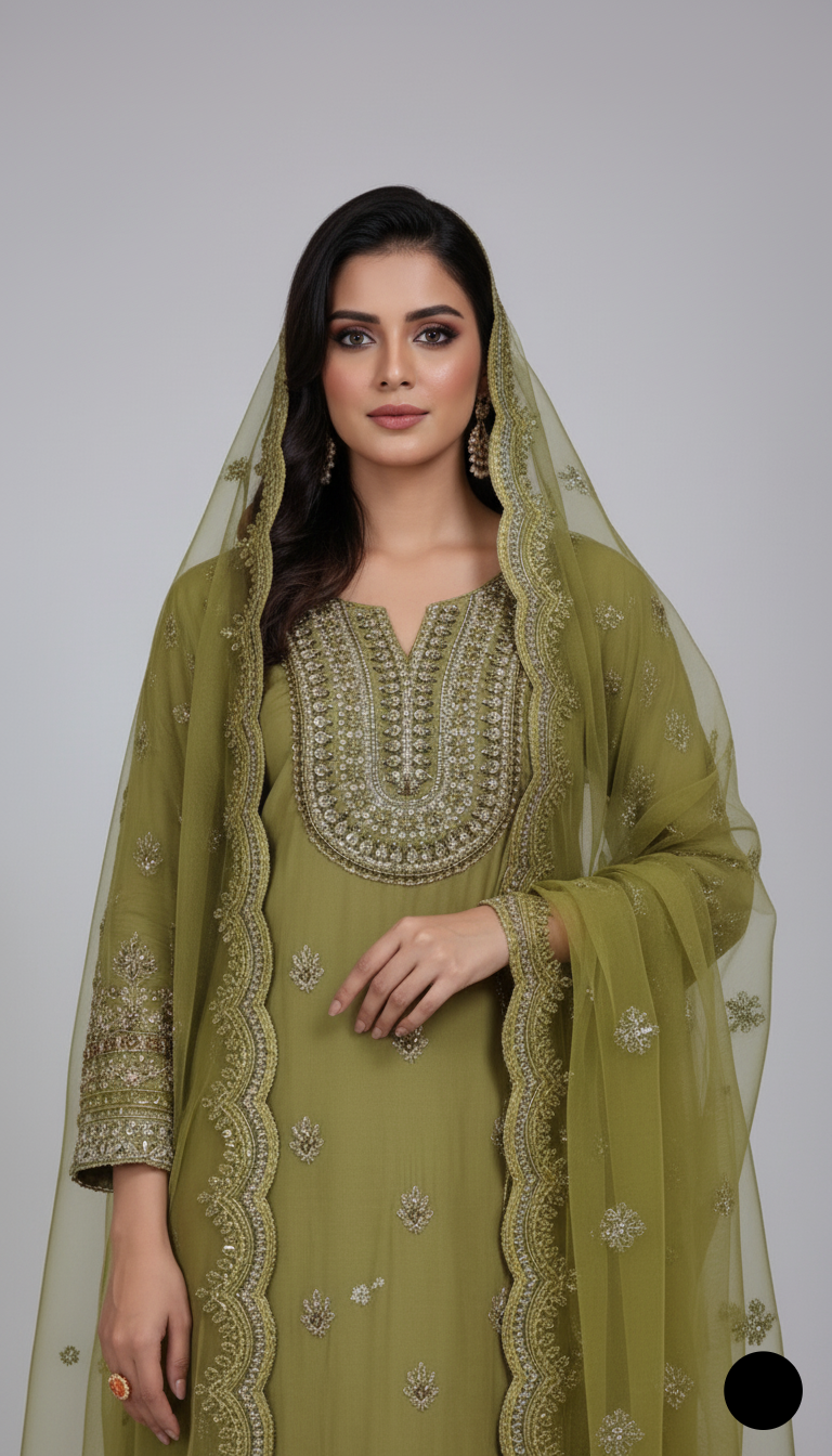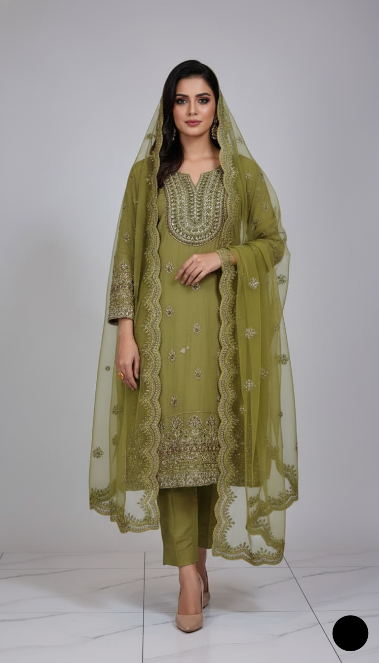 This beautiful ensemble features a short chiffon shirt paired with elegant grip plazo trousers and a light organza dupatta, offering a perfect blend of grace and style. With a shirt length ranging from 37 to 39 inches, the outfit presents a flattering and contemporary silhouette, suitable for all body types. Weighing 1.300 kg, it's ideal for festive occasions, formal events, and semi-casual gatherings—combining luxurious fabric with comfortable wear.
