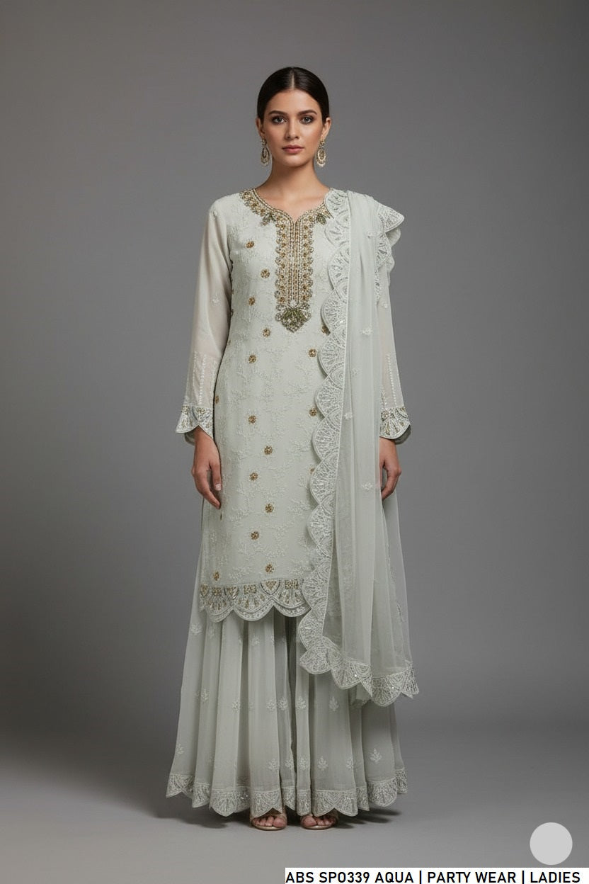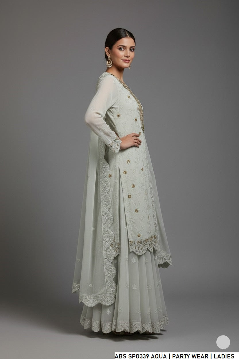 This stylish ensemble features a beautifully crafted chiffon shirt paired with matching chiffon trousers and an elegant organza dupatta. Designed in a classic shirt with sharara style, the shirt length ranges from 39 to 41 inches, offering a graceful and trendy look. With an overall weight of approximately 1.100 kg, this outfit is lightweight, flowy, and perfect for festive and formal occasions.