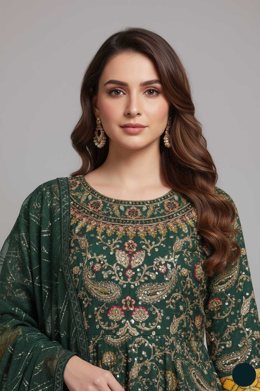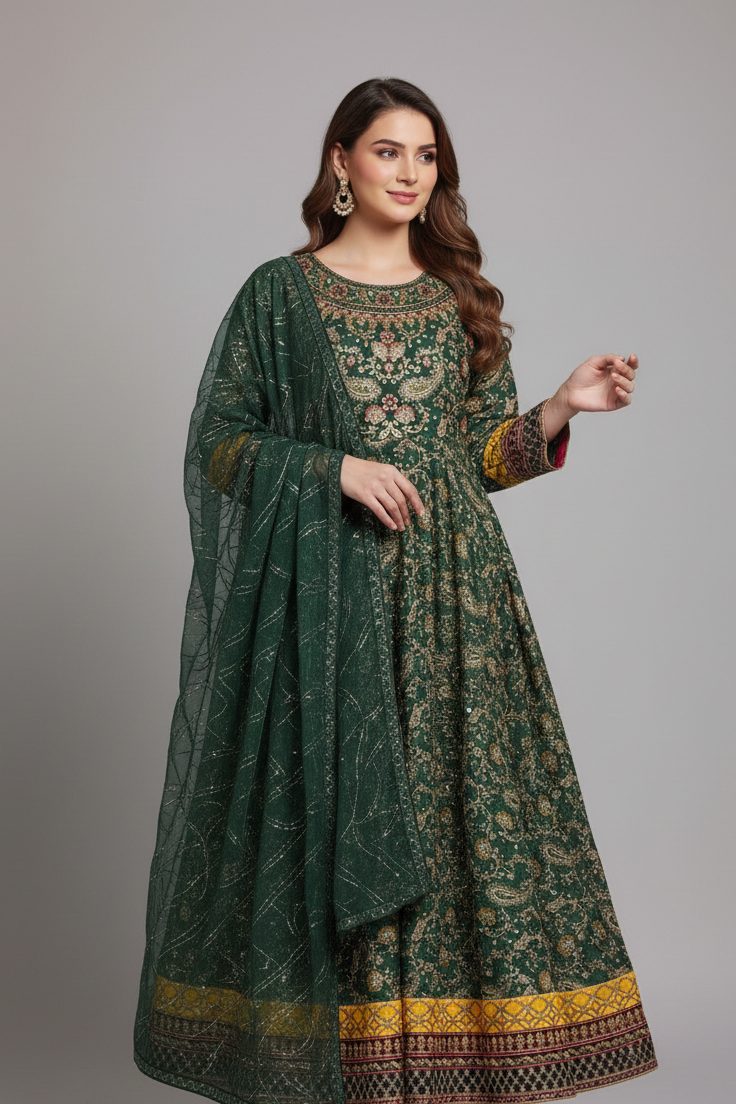 - This stunning outfit features a shirt made from delicate chiffon fabric, paired with a viscose trouser and a matching chiffon dupatta. The style showcases a full flare long frock, offering an elegant and flowing silhouette. With a shirt length of 54 to 56 inches and weighing approximately 1.200 kg, this ensemble provides both comfort and a graceful, flattering fit for any occasion.