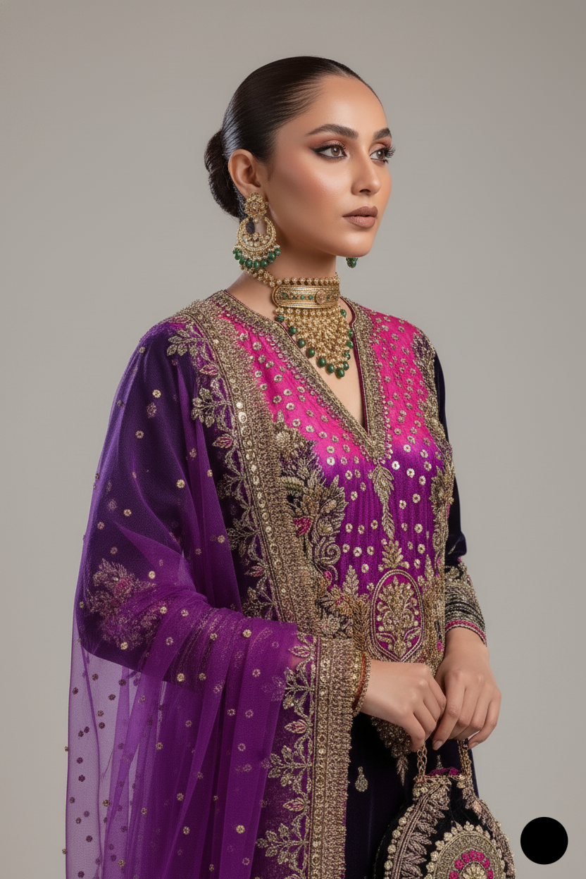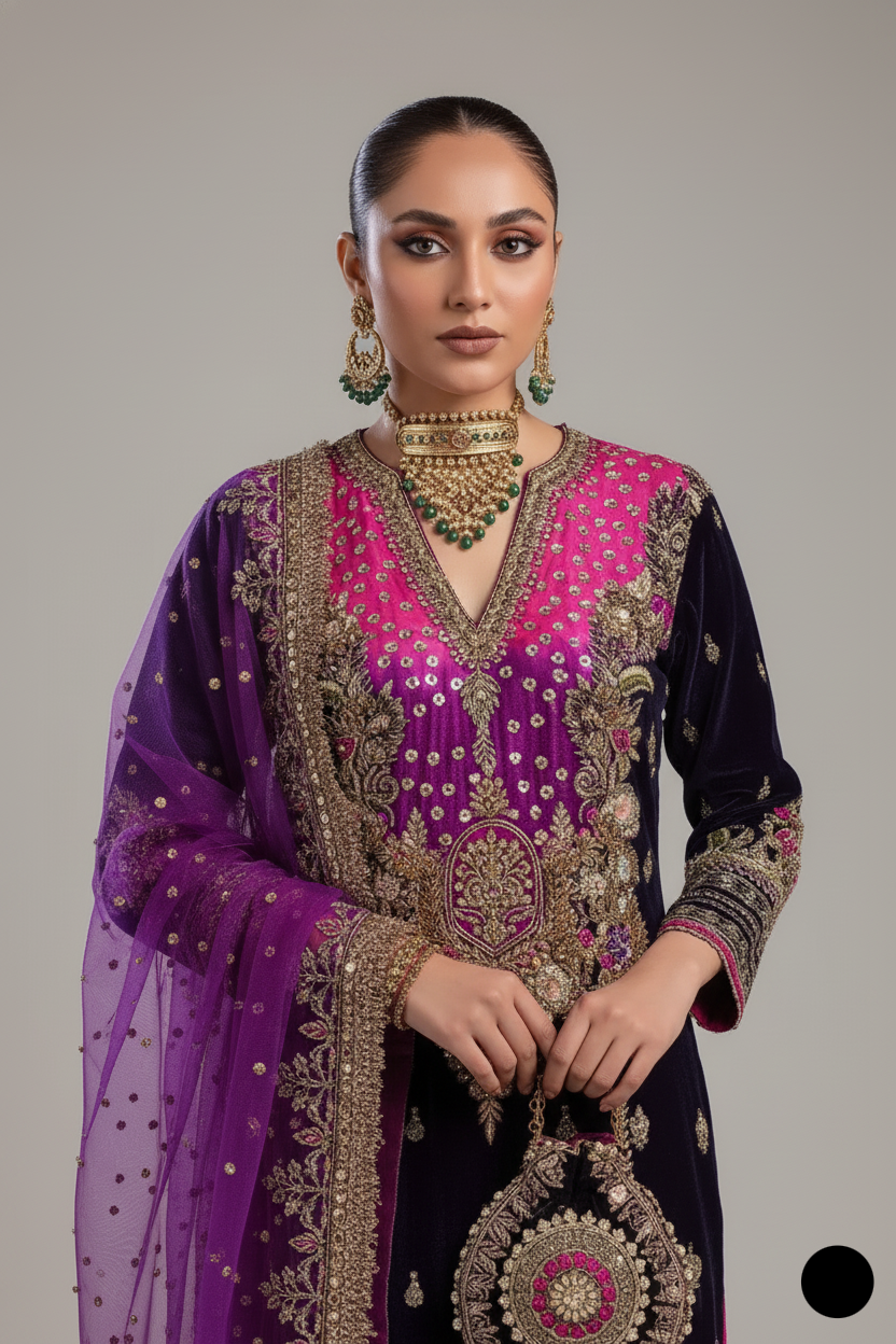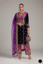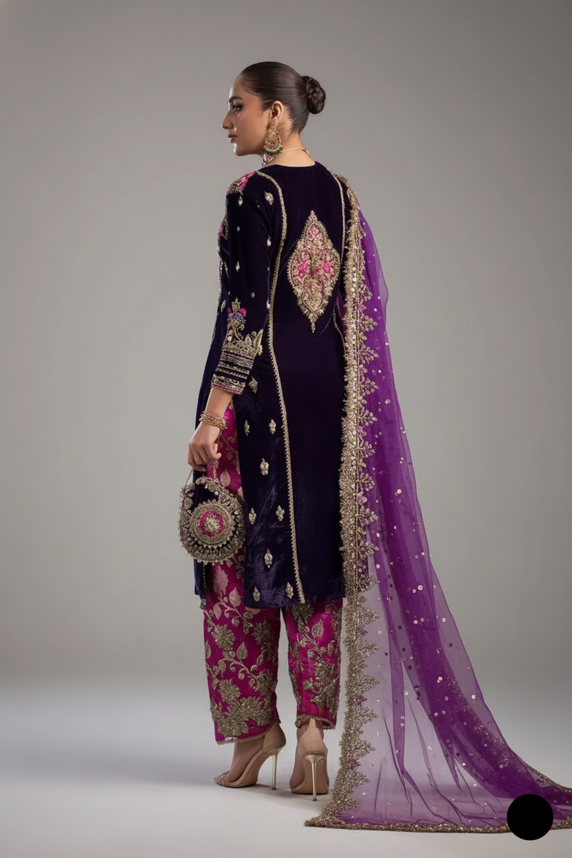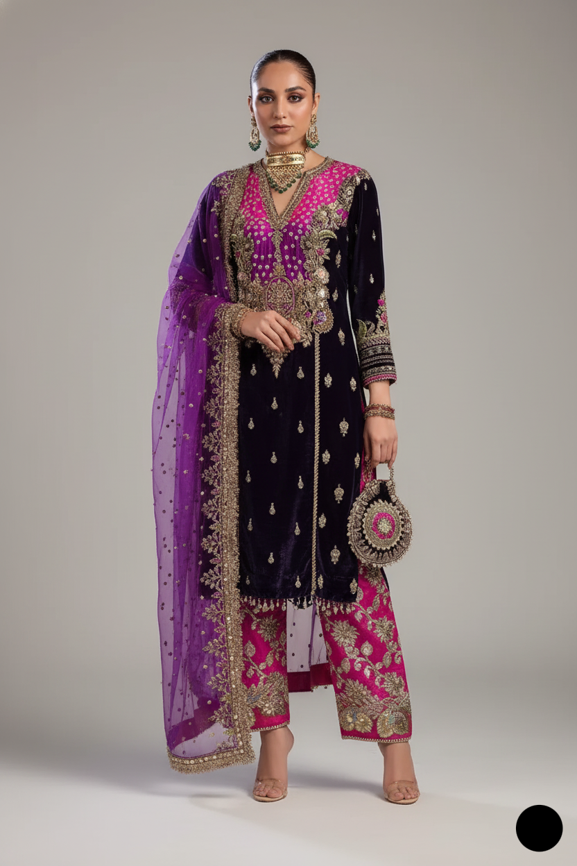 - This elegant outfit features a velvet shirt that offers both luxurious texture and a rich look. It is paired with jamawar trousers, adding a traditional yet sophisticated flair to the ensemble. The net dupatta enhances the overall appearance, contributing a delicate and airy touch. The straight-cut shirt, with a length of 40/42 inches, ensures a graceful and flattering fit. Weighing 1.300 kg, this ensemble is a perfect choice for a formal gathering, providing both comfort and style.