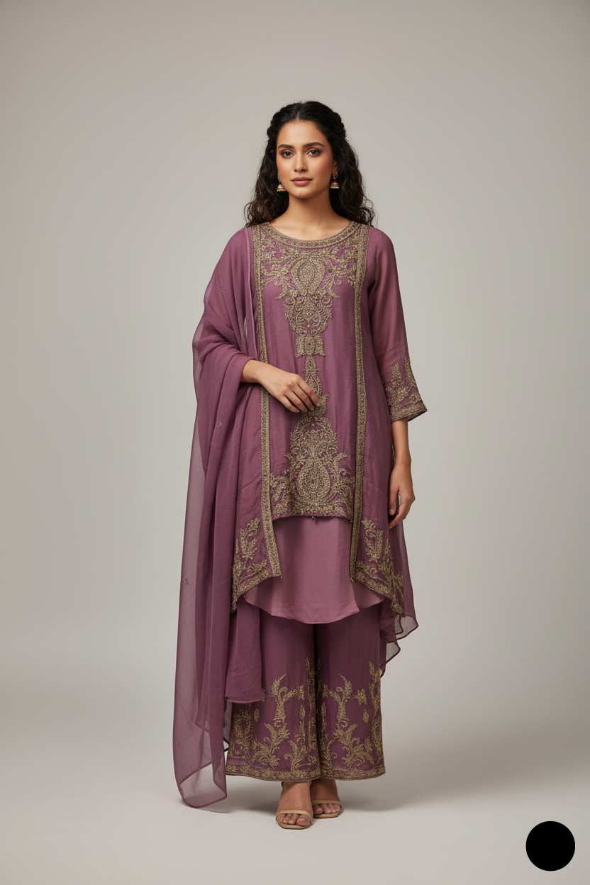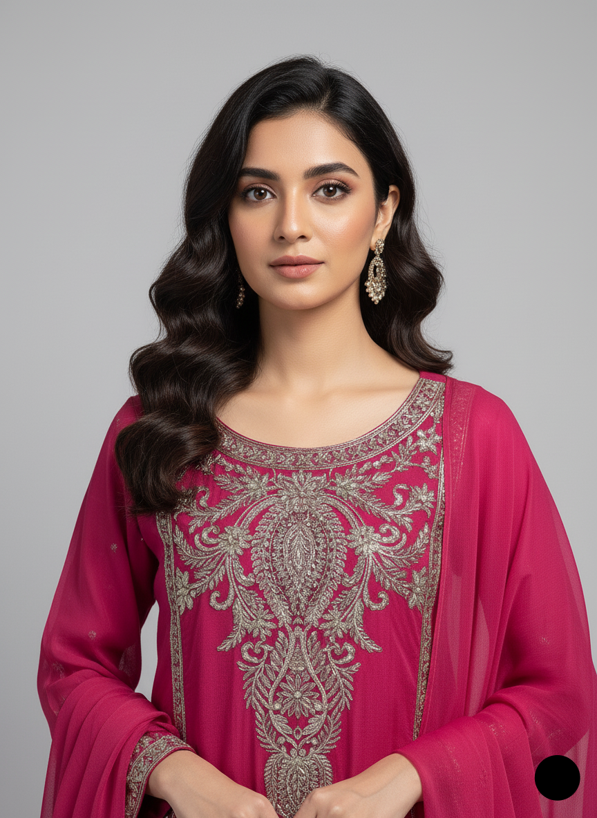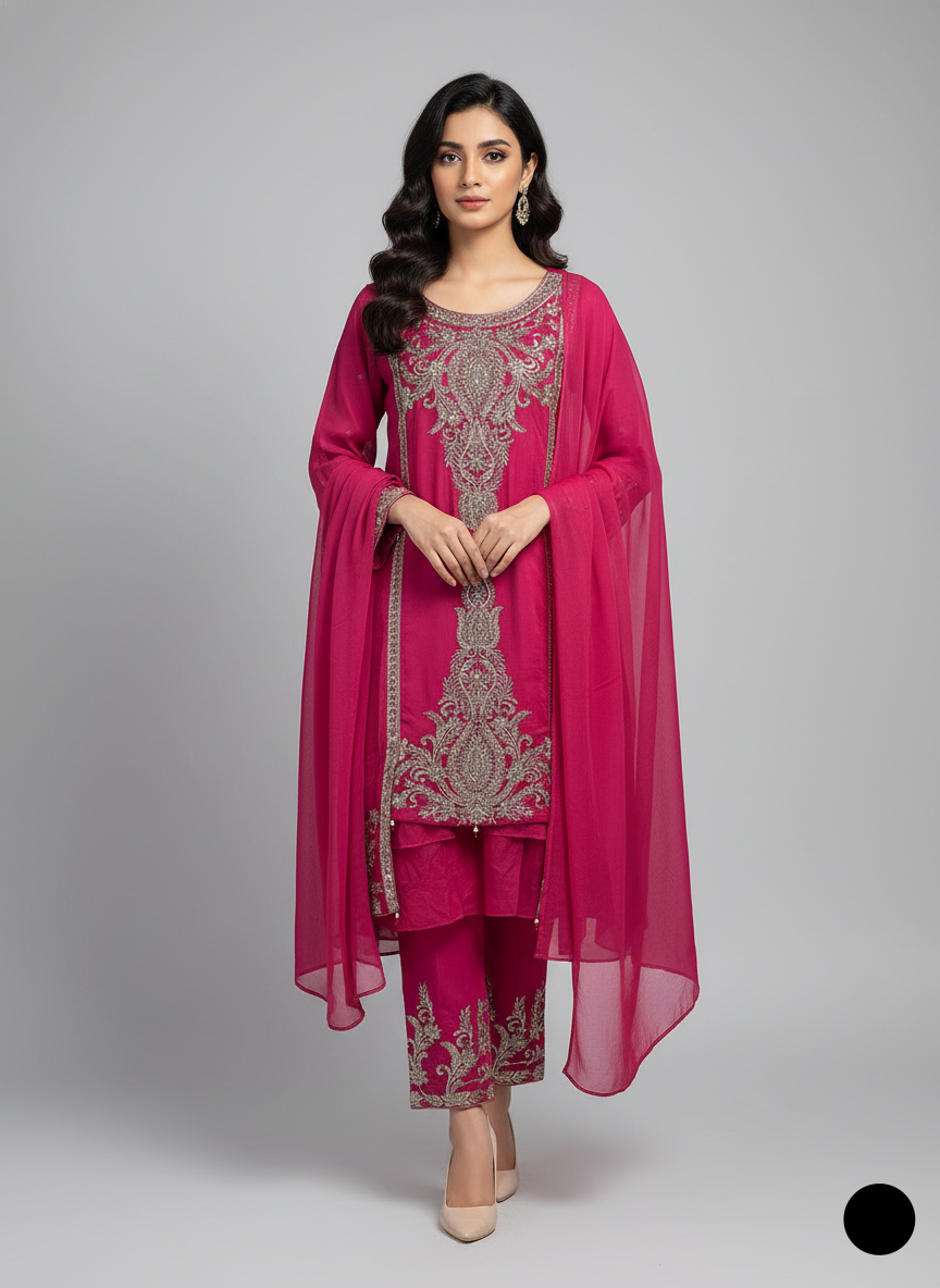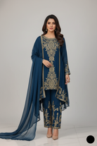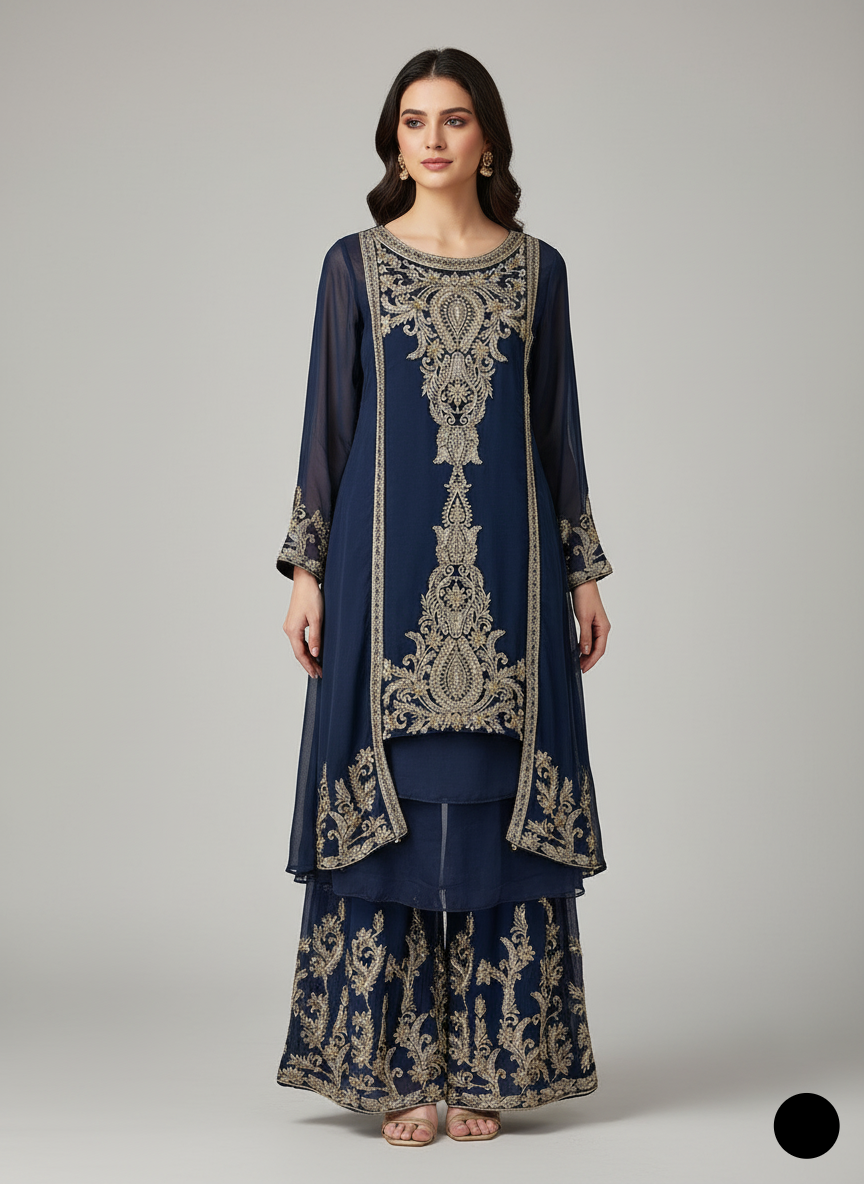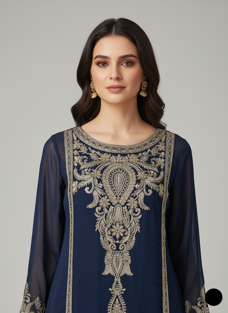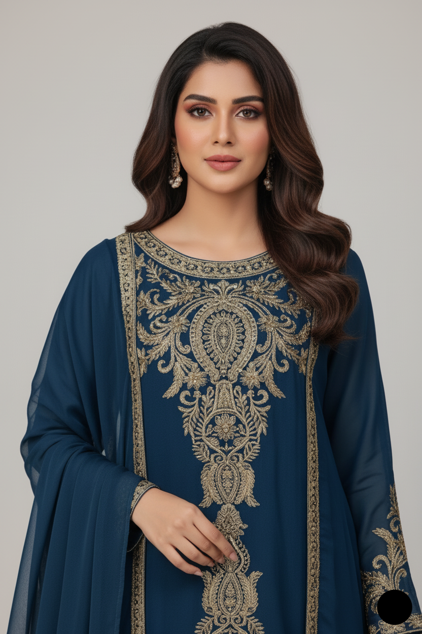 - This stunning gown-style frock is crafted from chiffon fabric, offering a graceful and flowing look. The shirt features a front length of 36 inches and a back length of 54 inches, providing an elegant silhouette. Paired with grip fabric trousers, the outfit combines modern style with traditional elegance. The dupatta is also made from chiffon, adding a delicate and airy touch to the ensemble. Weighing just 0.550 kg, this outfit is both lightweight and comfortable, making it perfect for special occasions or festive events.