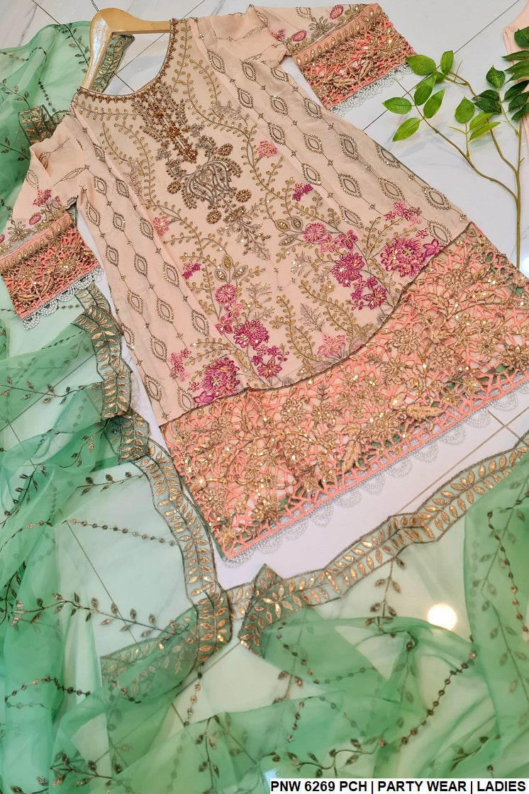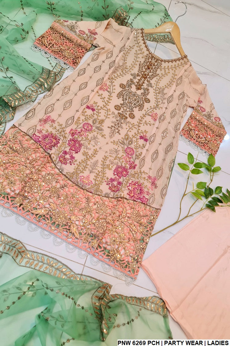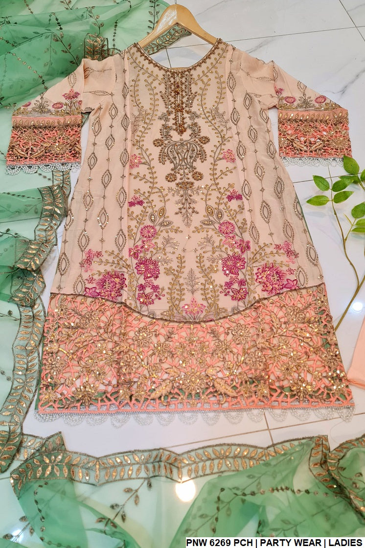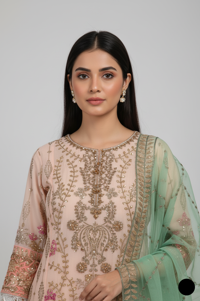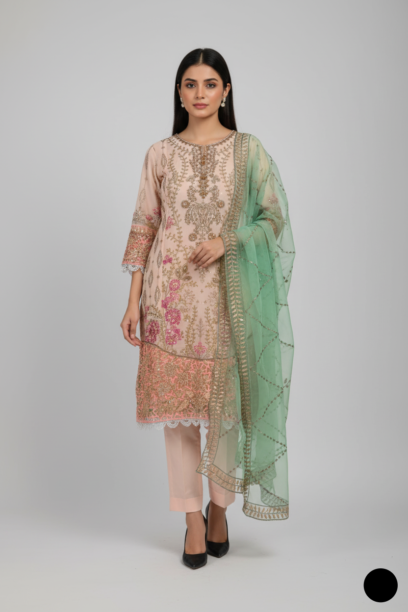 1. This stylish outfit features a chiffon shirt, offering a light and breathable feel, paired with grip fabric trousers that add a touch of structure to the ensemble. The dupatta is made from organza, enhancing the overall elegance of the look. Designed as a straight shirt, the style is both classic and versatile, making it suitable for a variety of occasions. With a shirt length of 43 to 45 inches, it provides a flattering fit for most body types. Weighing just 0.650 kg, this outfit is lightweight, ensuring comfort while maintaining its refined and sophisticated appearance.