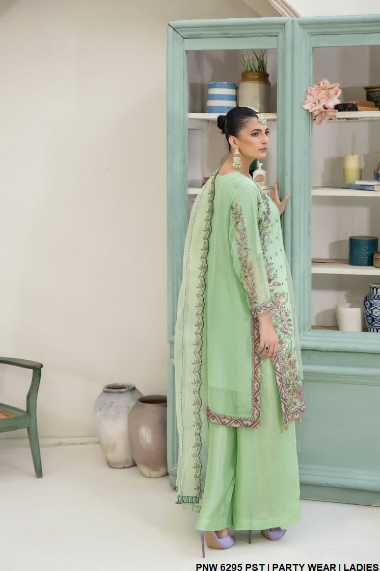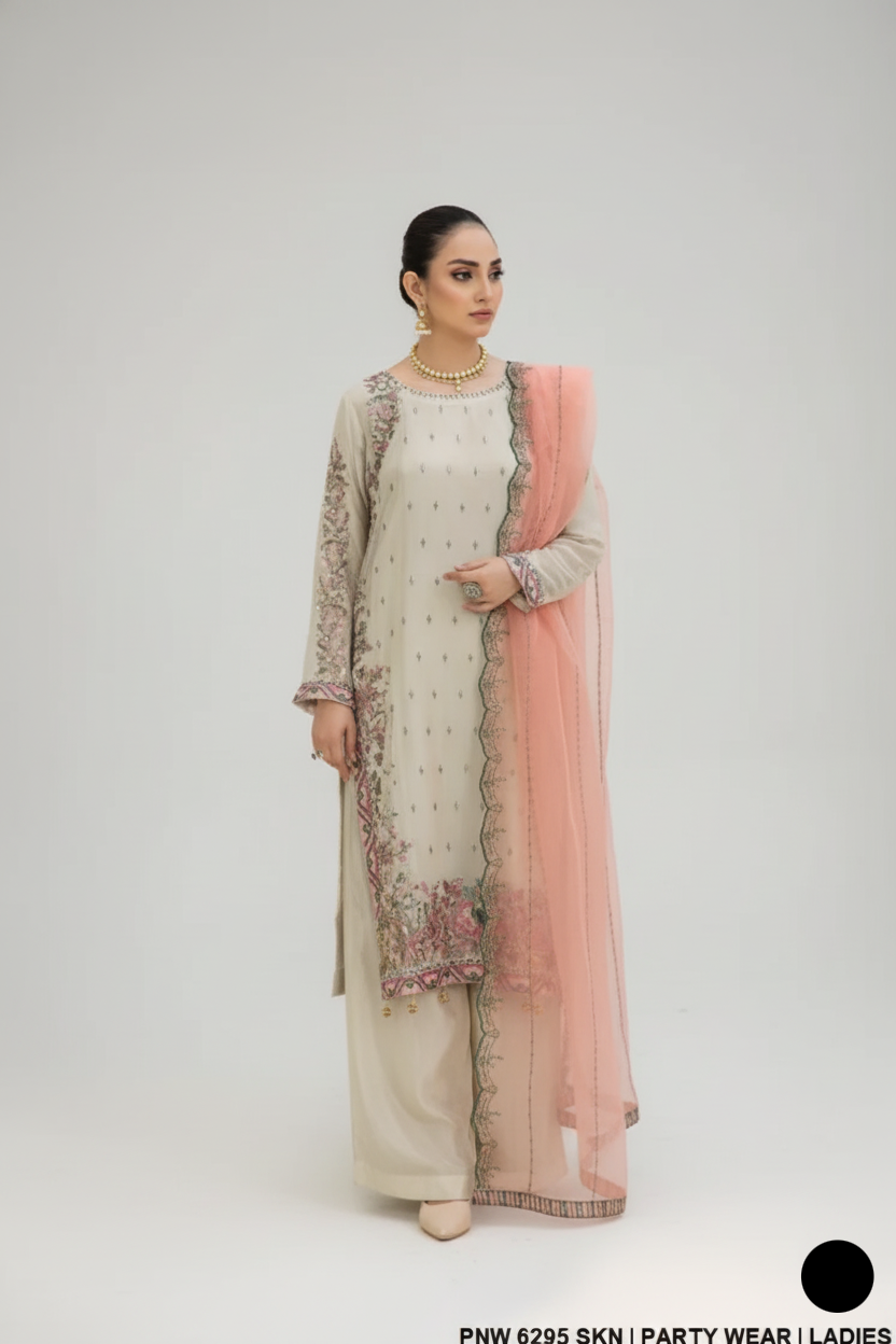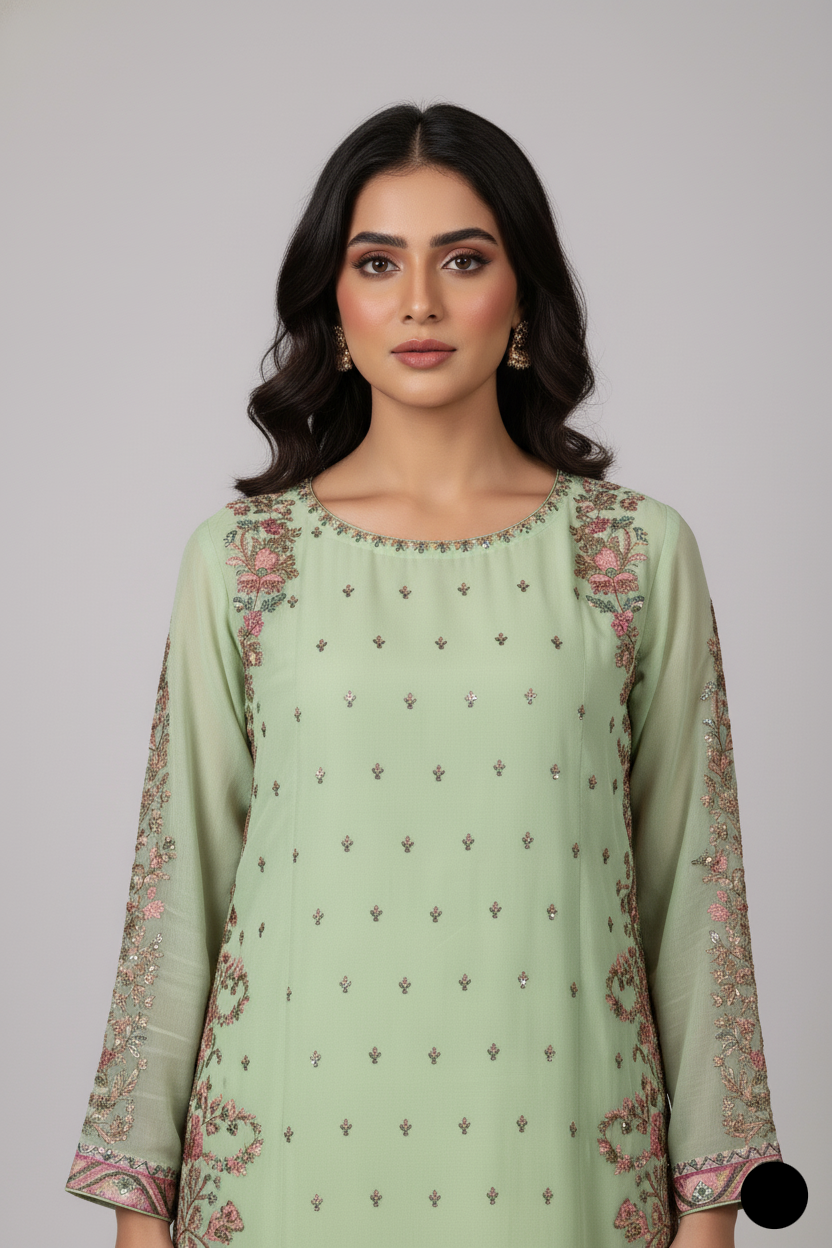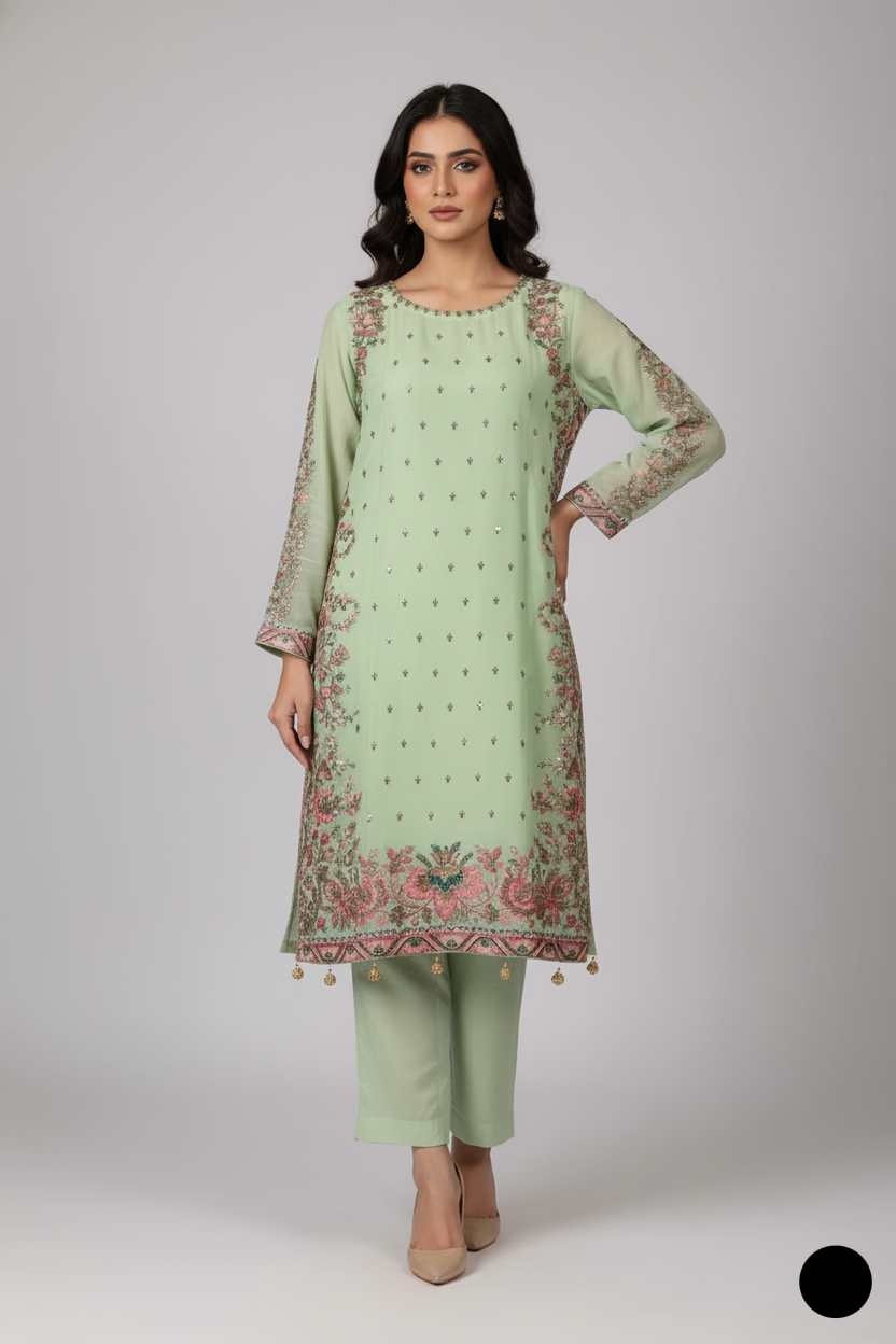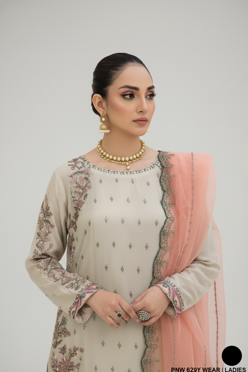 This elegant outfit features a straight shirt made from chiffon, offering a soft and breathable texture for all-day comfort. Paired with grip fabric trousers, it ensures a structured yet stylish fit. The look is completed with a delicate organza dupatta that adds a graceful touch to the ensemble. With a shirt length ranging from 38 to 40 inches and a total weight of only 0.550 kg, this outfit is lightweight and versatile—ideal for both casual gatherings and semi-formal occasions.