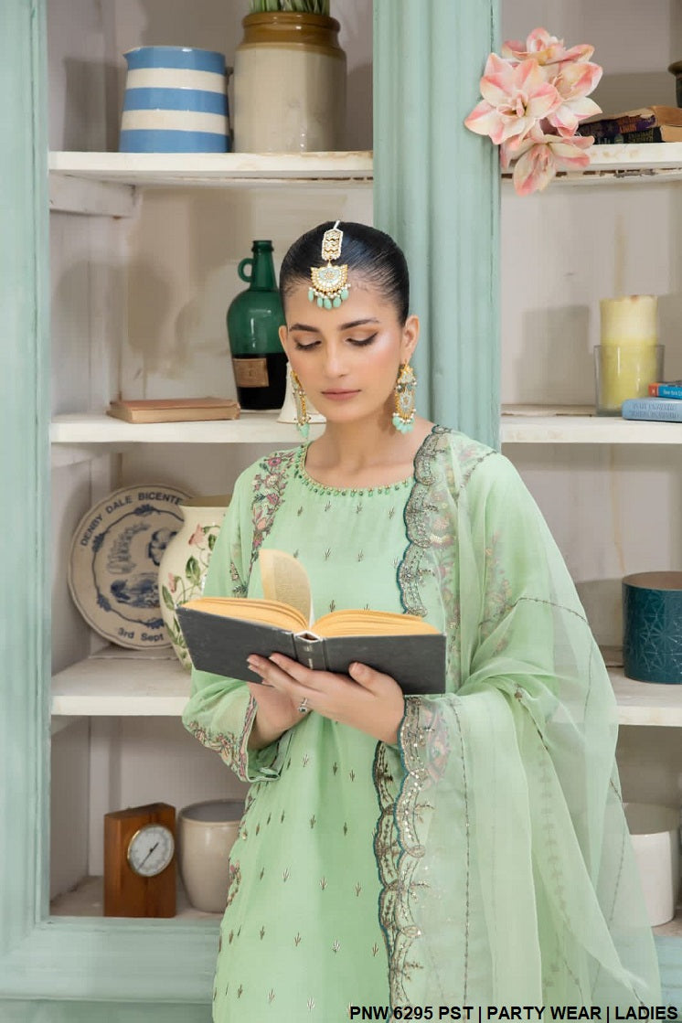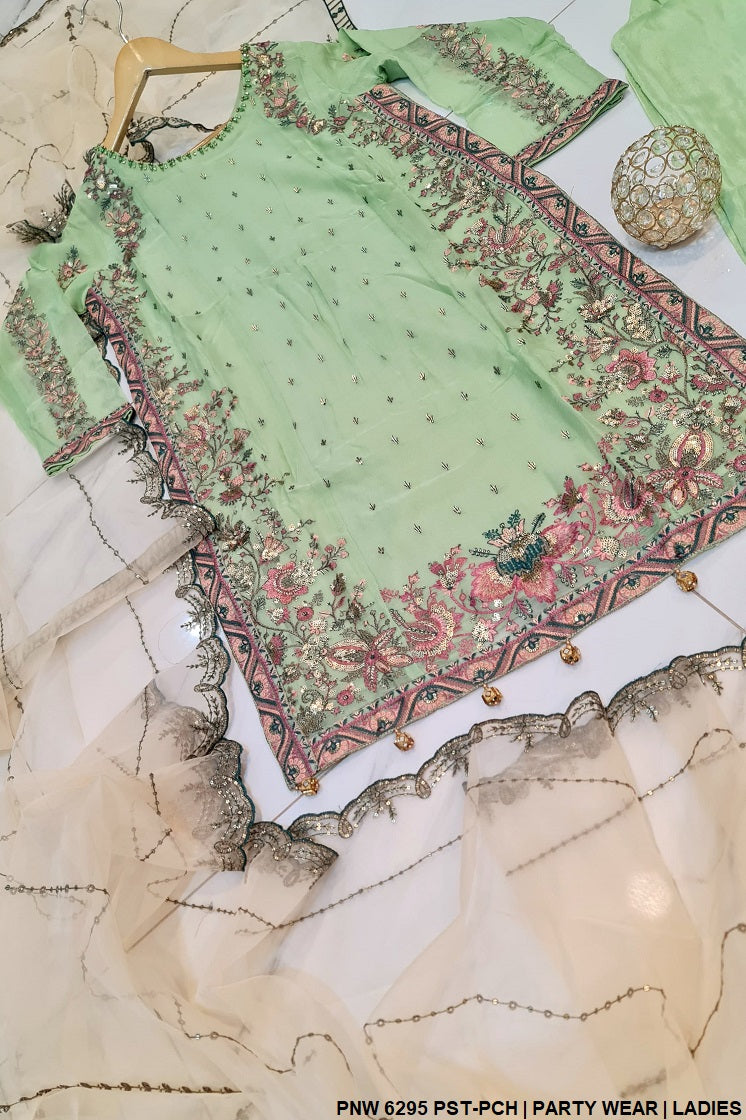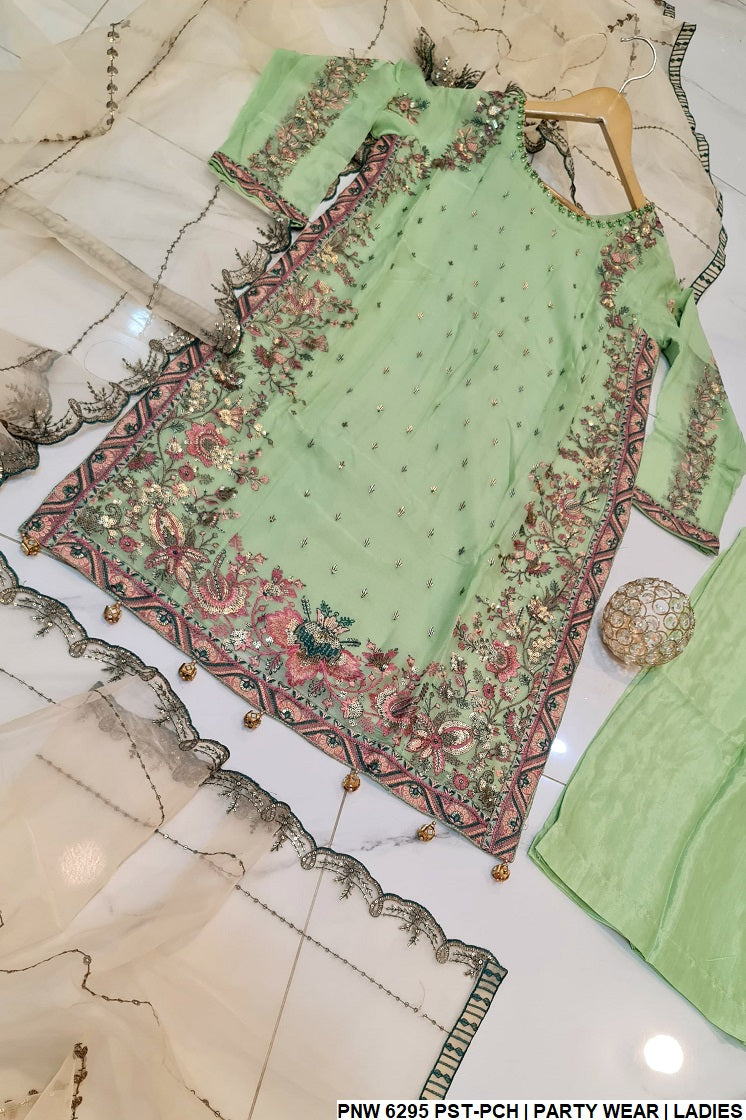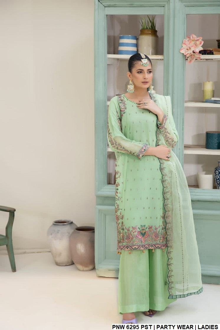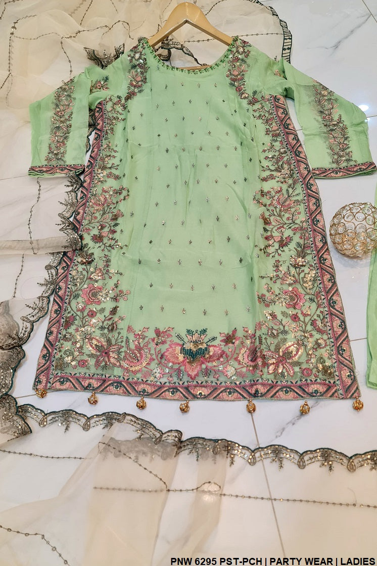 This elegant outfit features a straight shirt made from chiffon, offering a soft and breathable texture for all-day comfort. Paired with grip fabric trousers, it ensures a structured yet stylish fit. The look is completed with a delicate organza dupatta that adds a graceful touch to the ensemble. With a shirt length ranging from 38 to 40 inches and a total weight of only 0.550 kg, this outfit is lightweight and versatile—ideal for both casual gatherings and semi-formal occasions.