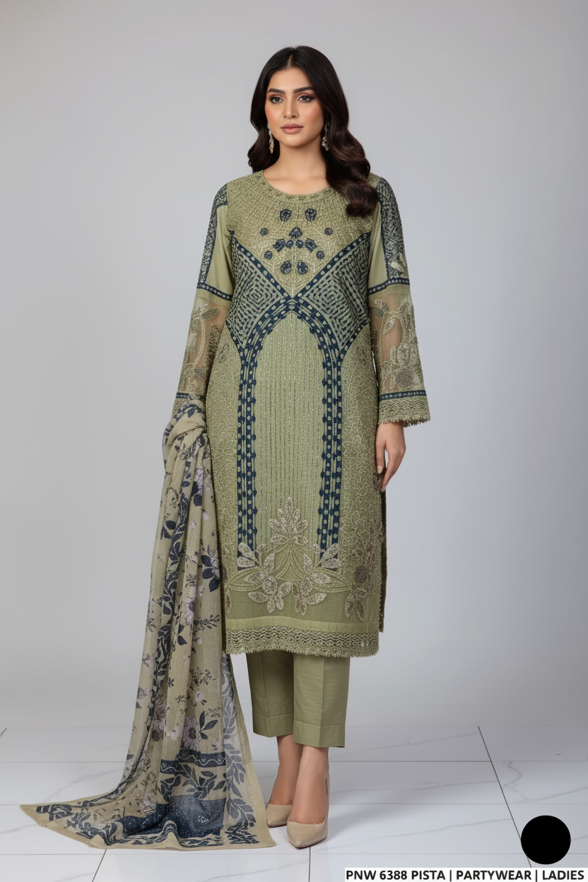 This beautifully designed outfit features a long, straight shirt made from premium chiffon, offering a graceful and breezy look. The trousers are crafted from grip fabric, delivering both structure and comfort for all-day wear. A digitally printed silk dupatta adds a modern and artistic flair to the ensemble, elevating its overall appeal. With a generous shirt length ranging from 42 to 44 inches and a total weight of 0.750 kg, this outfit provides both elegance and ease—perfect for festive occasions or formal gatherings.