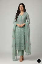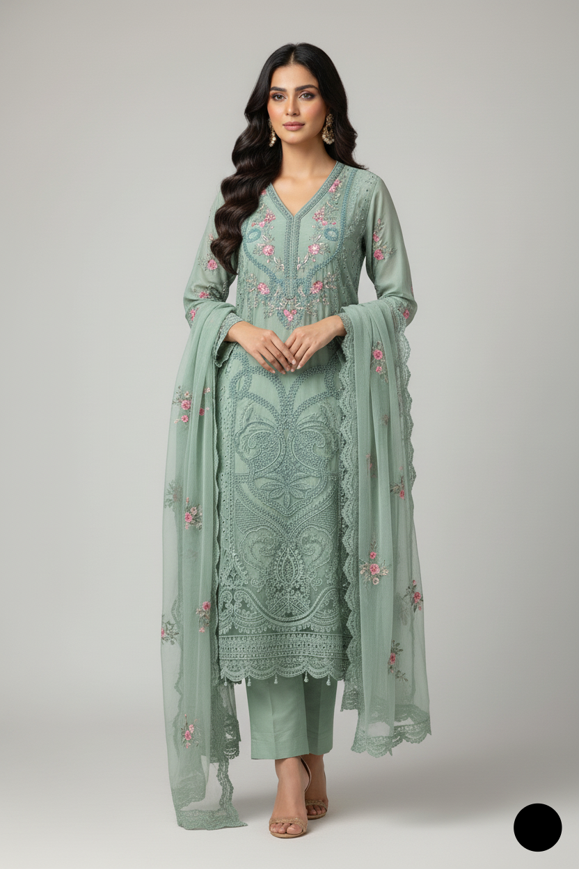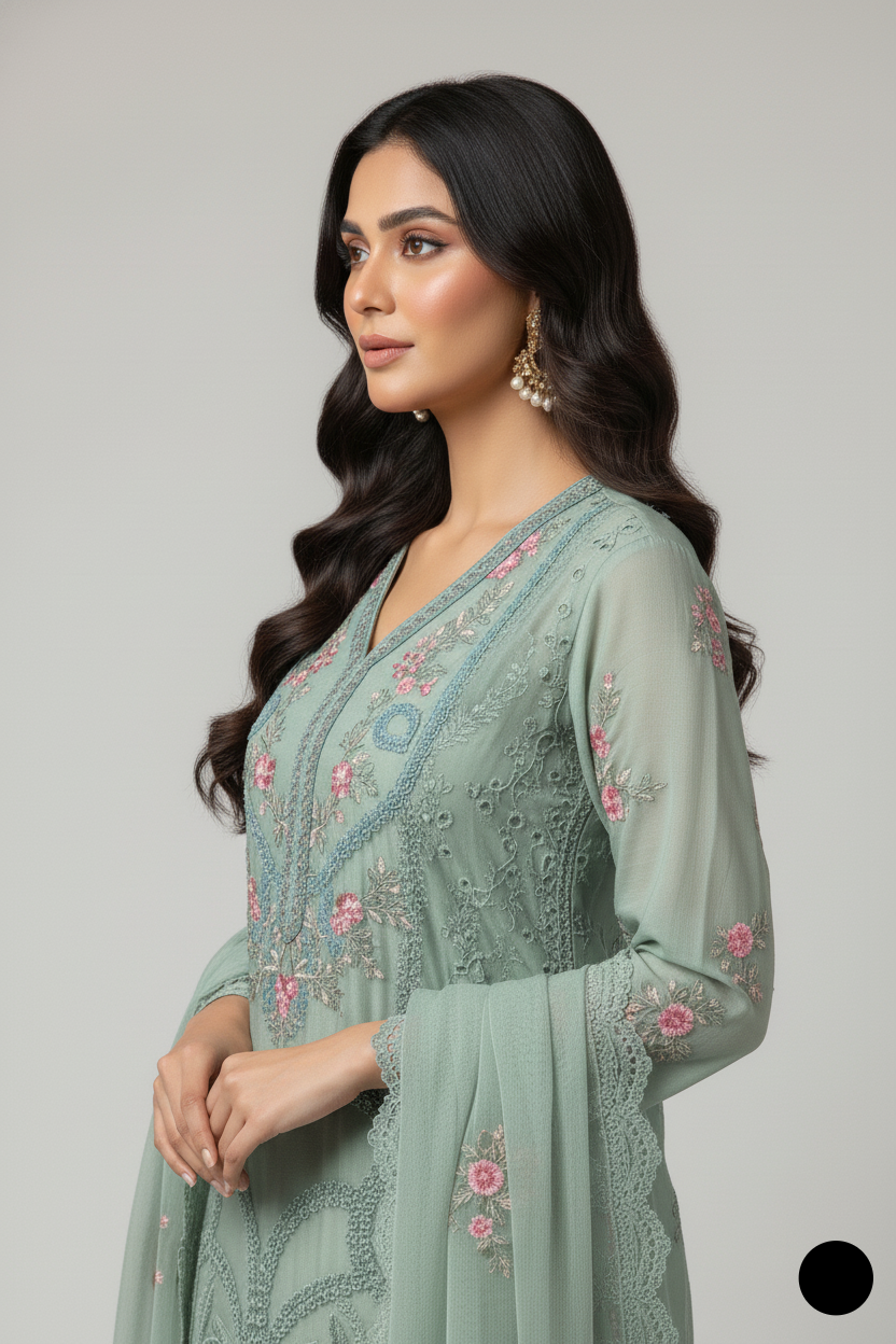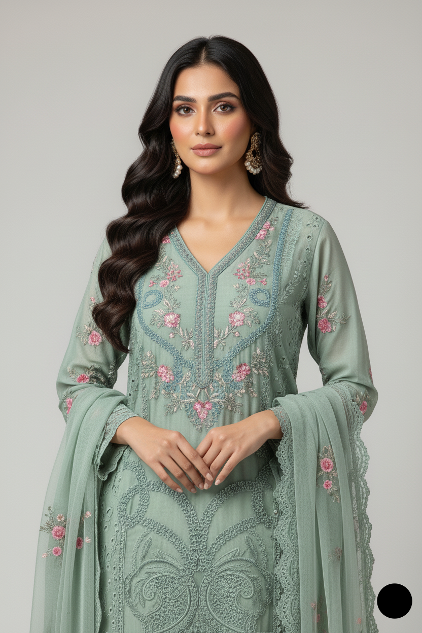 This elegant outfit features a straight shirt crafted from high-quality chiffon, paired with comfortable grip plazo trousers and a matching chiffon dupatta. The shirt has a length of 43 to 45 inches, offering a graceful silhouette suitable for formal or semi-formal occasions. The total outfit weighs approximately 0.700 kg, making it a lightweight yet luxurious choice for your wardrobe.