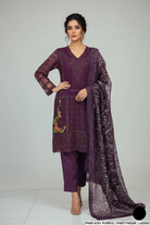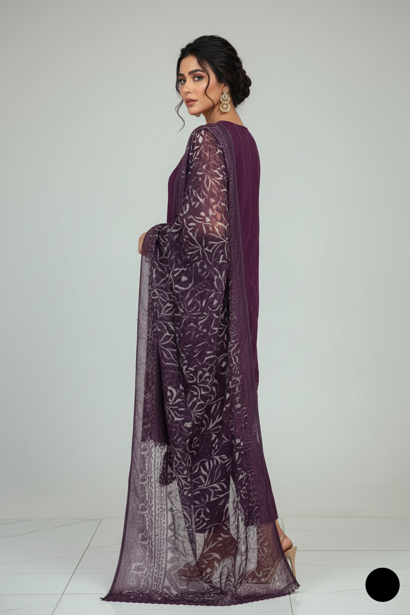This graceful 3-piece outfit includes a chiffon shirt, grip fabric plazo trousers, and a delicate organza dupatta. The straight shirt style creates a clean, elegant silhouette, making it perfect for semi-formal and festive occasions. With a shirt length of 40 to 42 inches and a total weight of just 0.750 kg, this ensemble offers both comfort and sophistication for day or evening wear.