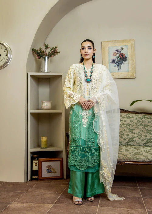 This graceful outfit features a straight chiffon shirt paired with a stylish plazo made from soft grip fabric, offering a flowy yet structured silhouette. The ensemble is elevated with a delicate organza dupatta, making it an ideal choice for semi-formal to formal gatherings. With a shirt length of 44/46 inches and a lightweight profile of just 0.650 kg, this outfit ensures comfort without compromising elegance.