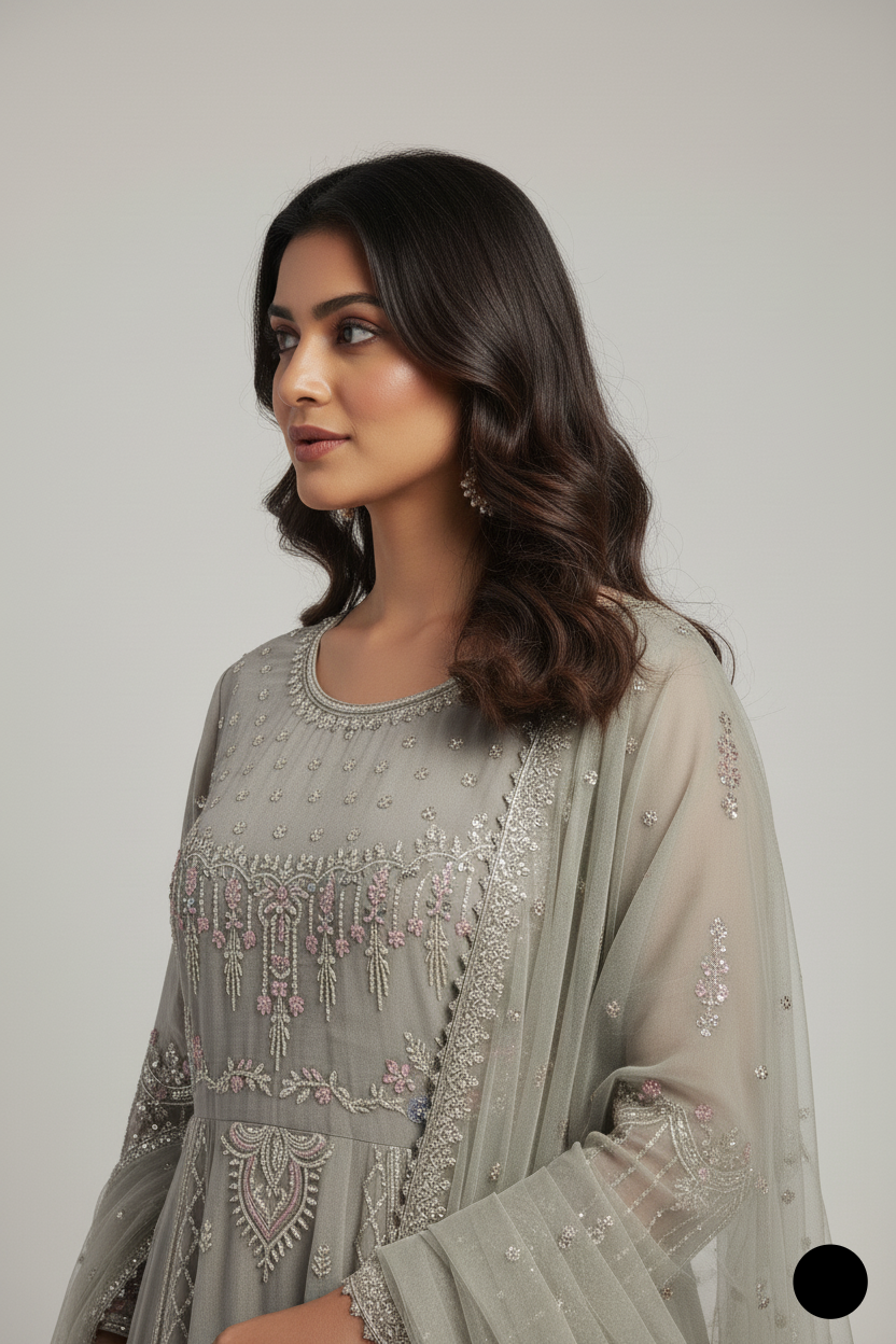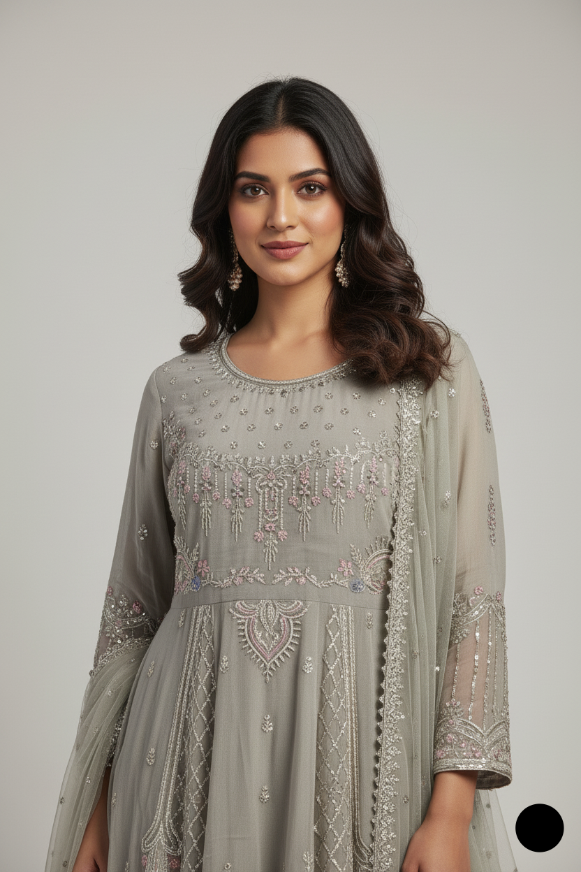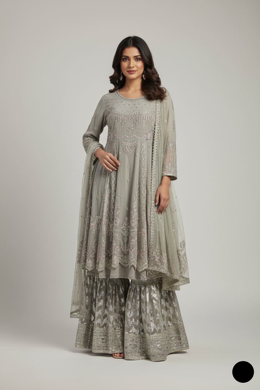 - This exquisite outfit features a chiffon shirt paired with zari organza trousers, combining elegance and luxury. The dupatta is made from masuri net, adding a delicate and refined touch to the ensemble. The style is a tail frock with plazo pants, offering a graceful and contemporary silhouette. The shirt comes in two length options, 42 inches and 49 inches, allowing for a customized fit. Weighing 1.300 kg, this outfit is slightly heavier but still lightweight enough for comfort, making it a perfect choice for formal occasions or special gatherings while maintaining an air of sophistication.