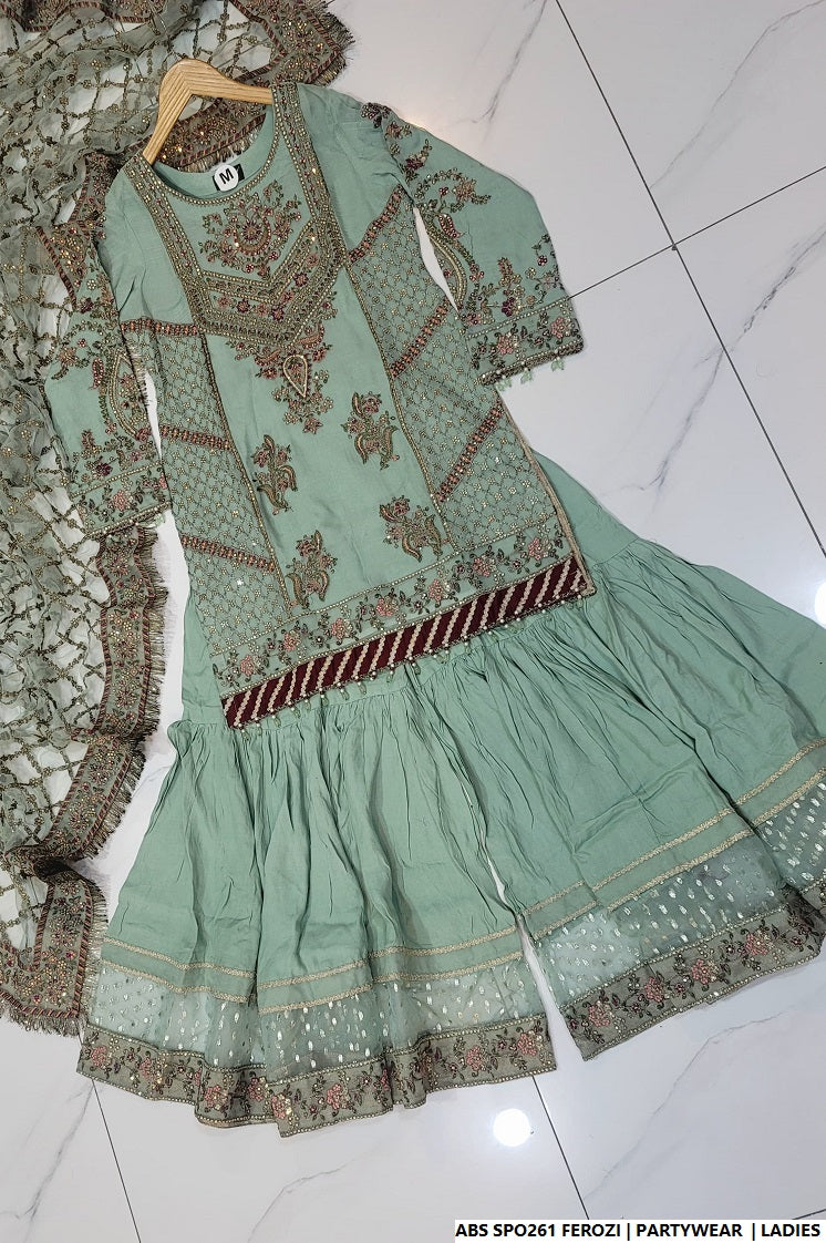 This chic and graceful outfit features a short straight chiffon shirt with a length of 33 to 35 inches, giving it a youthful, modern appeal. It is paired with a beautifully flared grip gharara, offering traditional elegance with contemporary comfort. The look is completed with a soft net dupatta, adding a delicate and ethereal touch. Weighing 1.250 kg, this ensemble is ideal for weddings, festive occasions, or formal functions where elegance meets timeless charm.