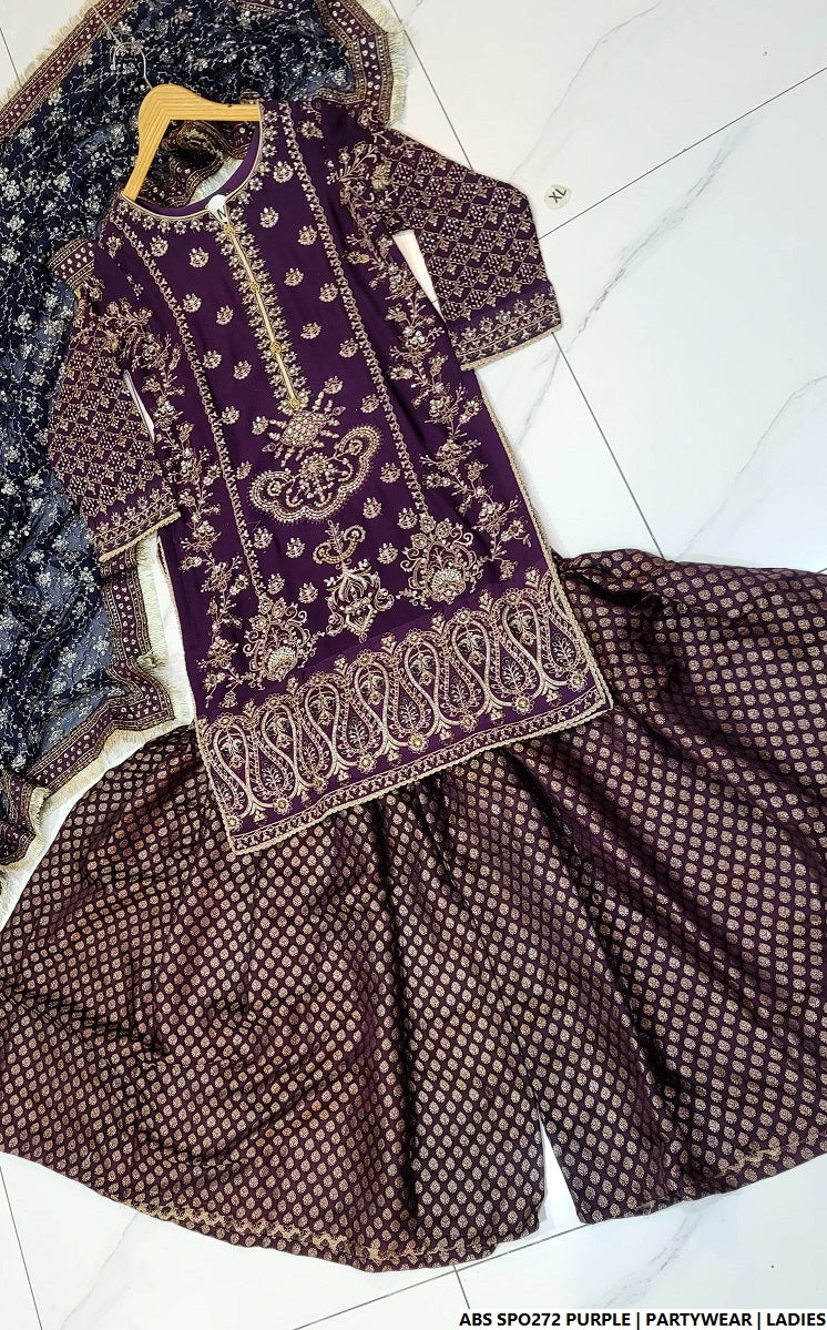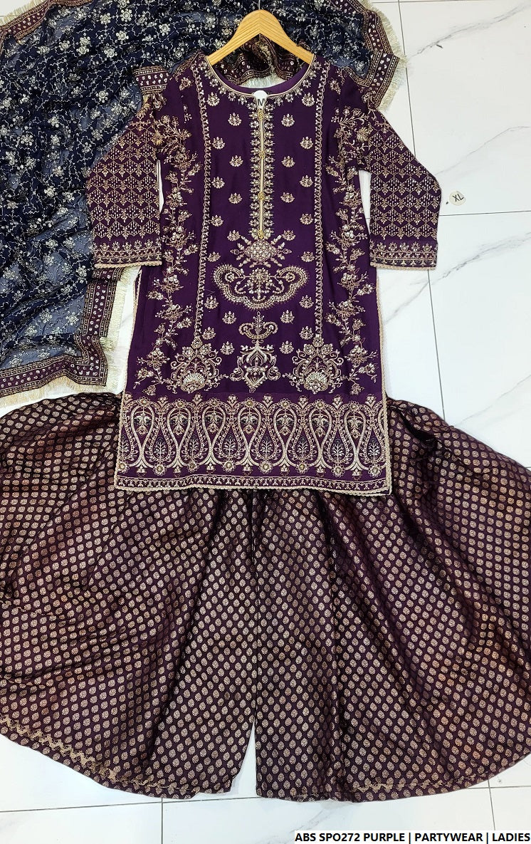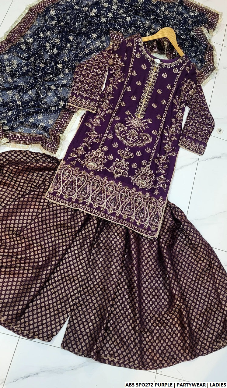 This refined ensemble features a straight shirt crafted from soft chiffon, designed to offer a graceful silhouette with a shirt length of 40 to 42 inches. The shirt is paired with a luxurious gharara made from rich jamawar fabric, adding depth, texture, and traditional charm to the outfit. A matching chiffon dupatta brings an airy elegance that balances the heavier elements beautifully. Weighing 1.250 kg, this outfit is a stunning choice for weddings, festive events, or any special occasion where elegance is key.