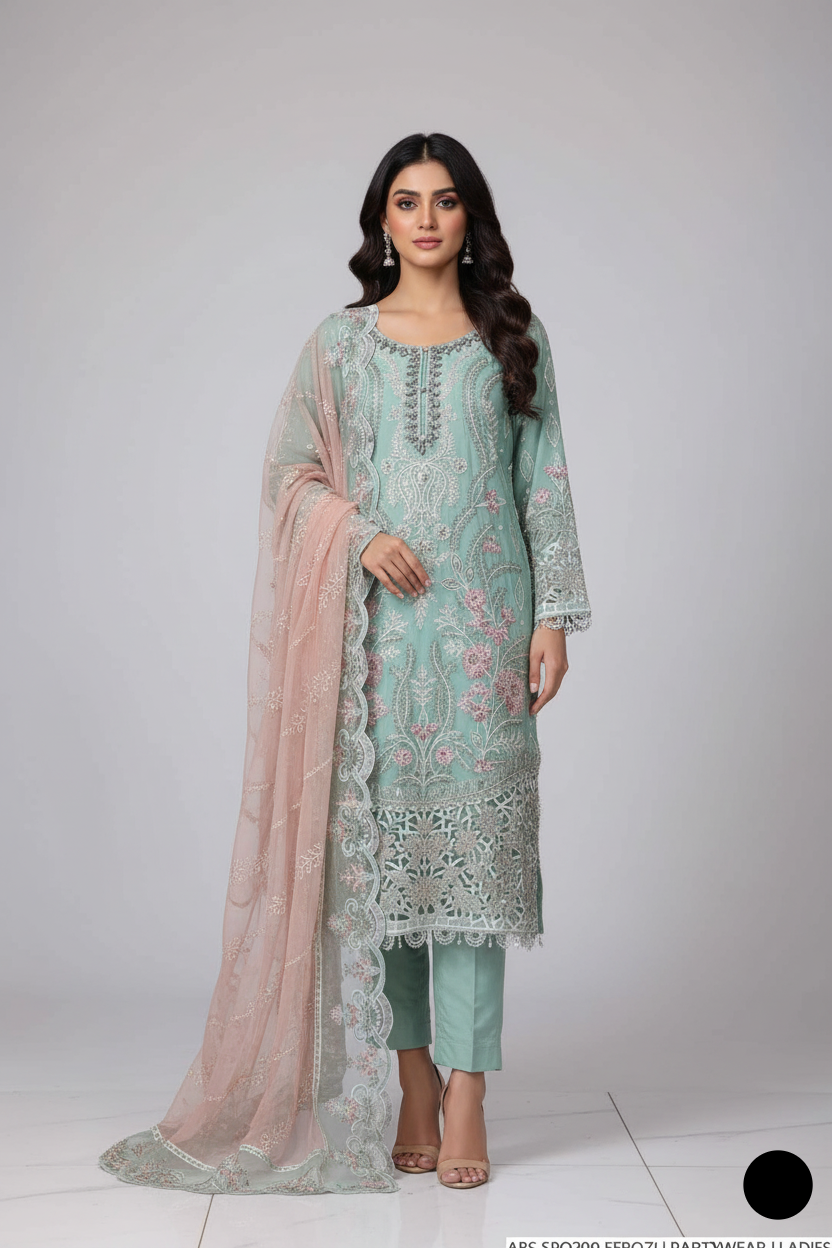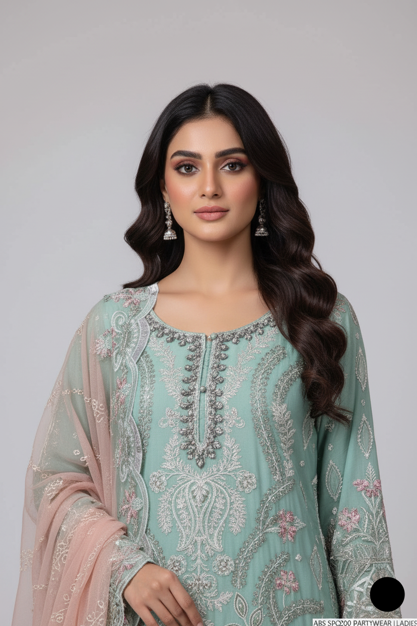 This chic and versatile outfit features a chiffon straight shirt, tailored for a clean and classic look. It's paired with a sleek grip trouser, offering comfort and a flattering fit. A chiffon dupatta completes the ensemble, adding an airy, elegant touch. With a shirt length of 42/44 inches and a total weight of just 0.900 kg, this outfit is perfect for casual gatherings, semi-formal events, or day-to-evening transitions with effortless style.