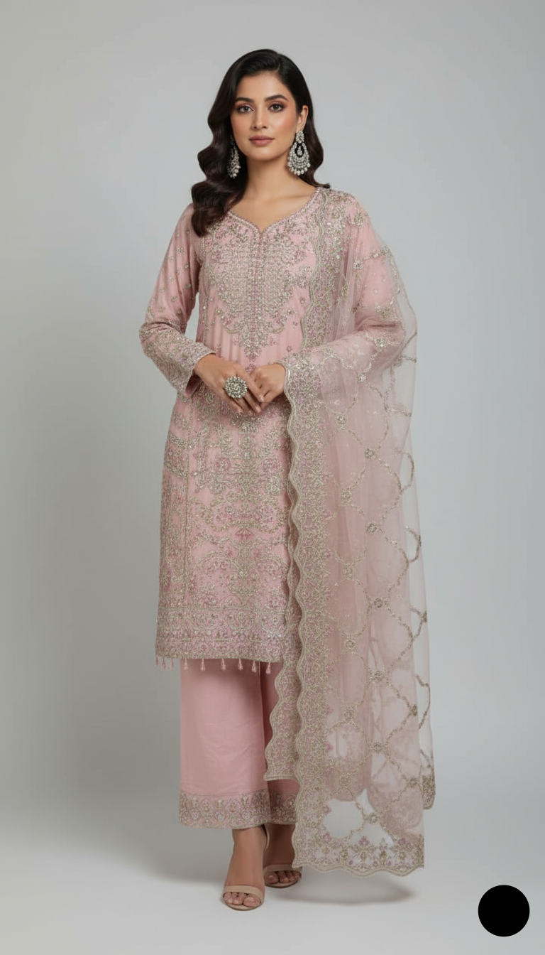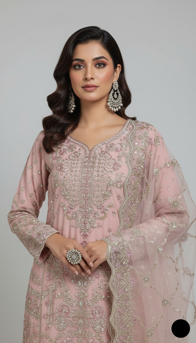 This stylish outfit features a chiffon shirt beautifully paired with viscose plazo trousers and a lightweight organza dupatta. Designed for both comfort and elegance, the shirt length ranges from 38 to 40 inches, offering a graceful silhouette. With a total weight of just 1.050 kg, this ensemble is perfect for formal events, festive occasions, or semi-casual gatherings, giving you a refined look without compromising ease of wear.