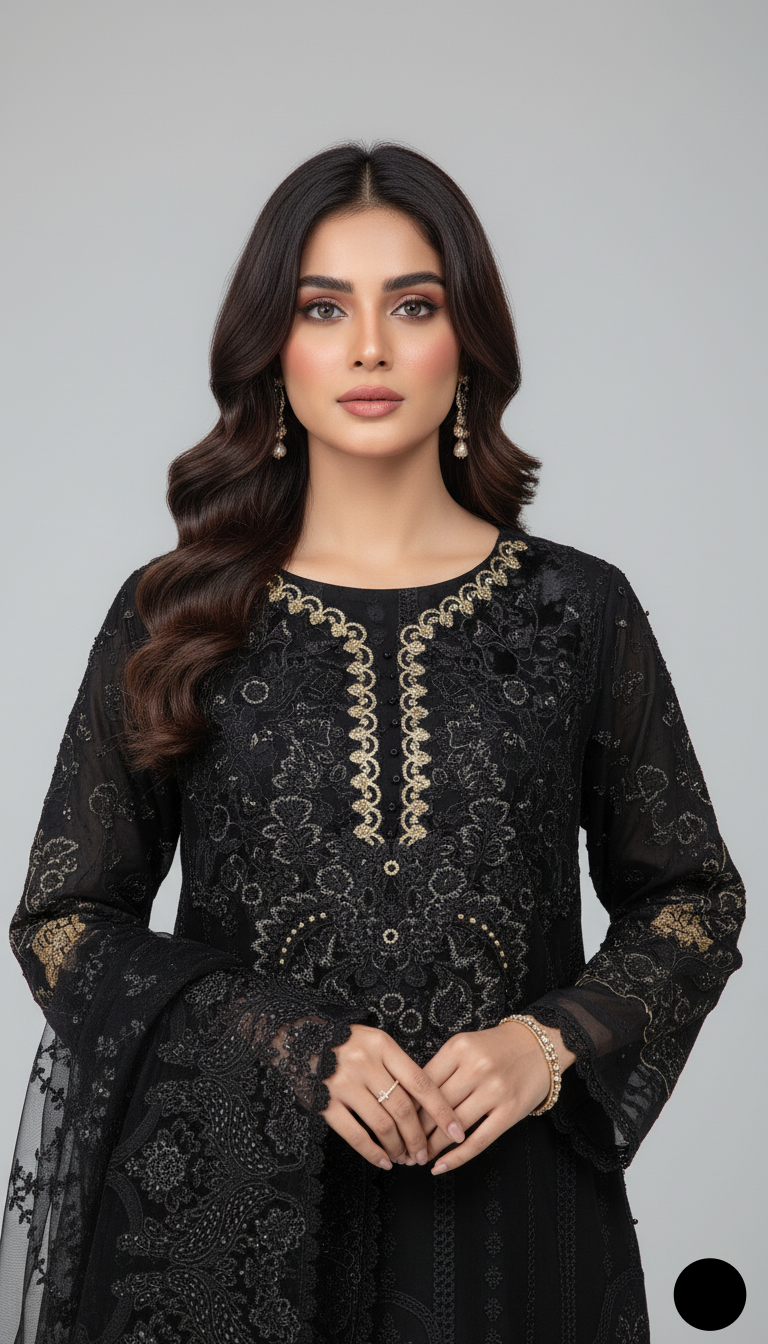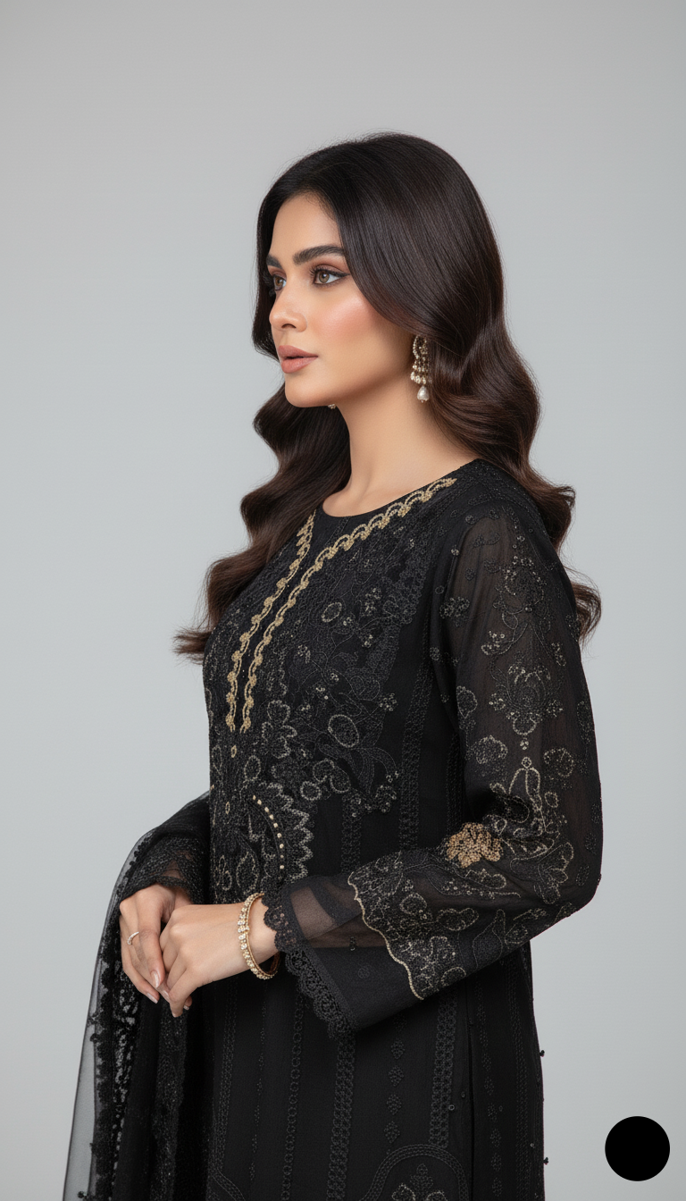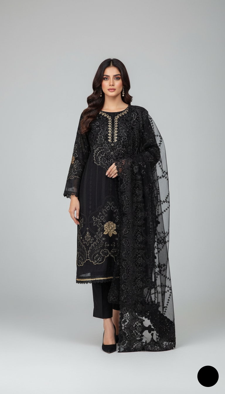 This elegant outfit features a chiffon A-liner shirt beautifully styled for a graceful flow, paired with comfortable grip trousers and a lightweight net dupatta. With a shirt length of 46 to 48 inches, the design offers a modest yet modern silhouette that flatters all body types. Weighing just 1.050 kg, this ensemble is ideal for formal gatherings, semi-formal events, and festive celebrations, combining style and ease of wear effortlessly.