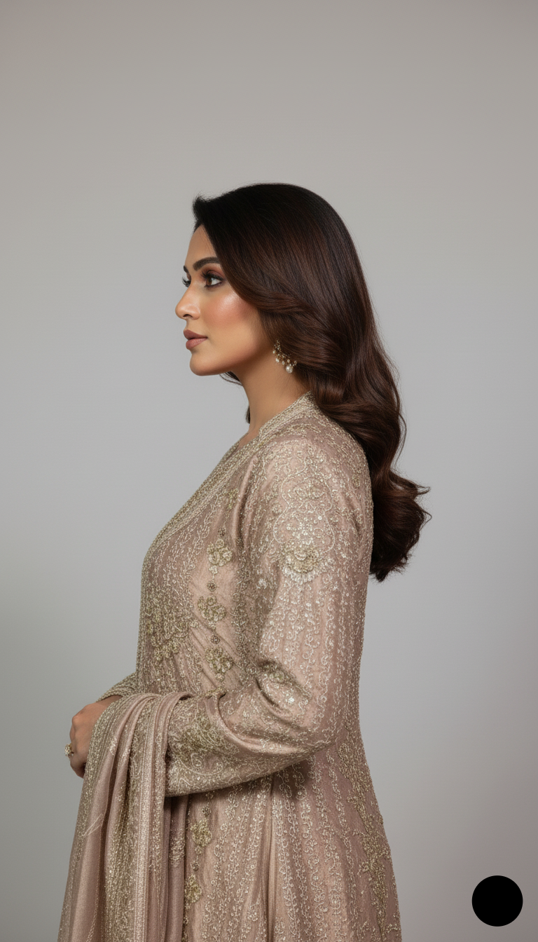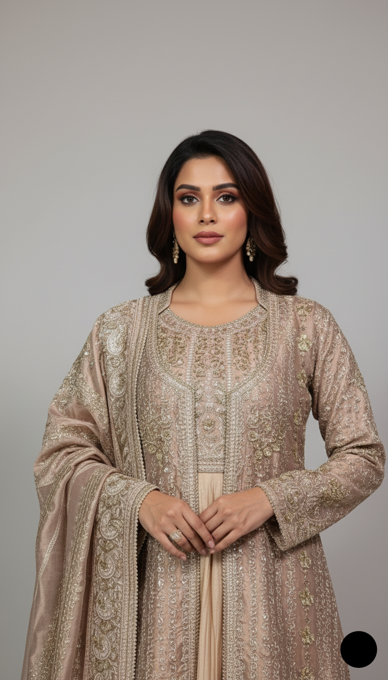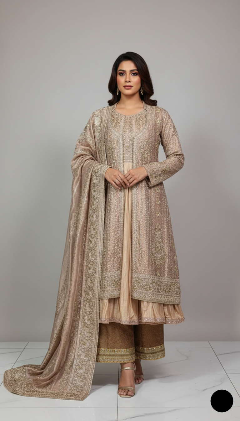 This luxurious outfit features an open long maxi crafted from rich Masuri fabric, paired elegantly with classic Jamawar trousers and a matching Masuri dupatta. The shirt length ranges from 48 to 50 inches, offering a regal, floor-length silhouette perfect for weddings, formal receptions, or festive occasions. With a substantial weight of 2.350 kg, this ensemble gives a premium, high-end feel while ensuring you stand out with timeless elegance and traditional charm.