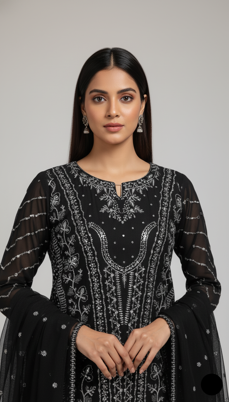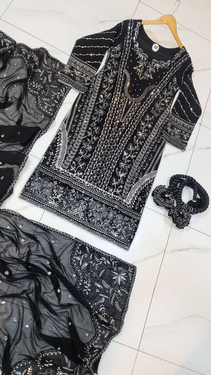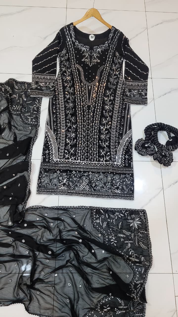 This graceful outfit is designed with a chiffon shirt and a matching chiffon dupatta, paired elegantly with a grip plazo trouser. The straight shirt with plazo style gives a modern yet traditional appeal, making it ideal for both casual gatherings and festive occasions. With a shirt length of 45/47 inches and a total weight of 1.050 kg, this outfit offers both style and comfort. Please note that product colors may vary slightly due to lighting or device display differences.