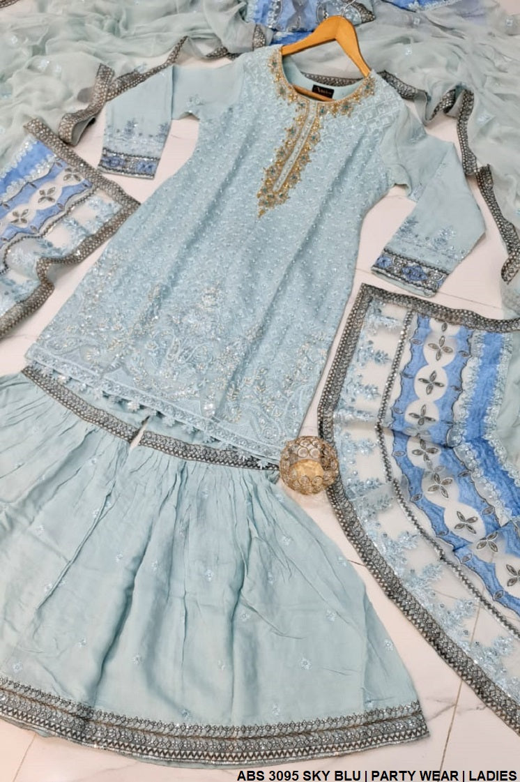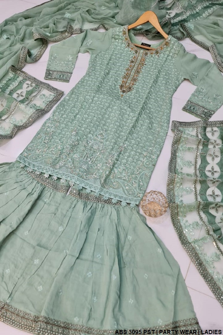 1. This outfit features a straight shirt with a gharara, combining elegance with tradition. The shirt is crafted from chiffon, offering a lightweight and graceful drape, with a length of 35 to 37 inches. The gharara is made from grip fabric, ensuring a structured yet comfortable fit. Complementing the ensemble is a chiffon dupatta, adding a touch of sophistication. The entire outfit weighs approximately 1.50 kg, making it both stylish and easy to carry