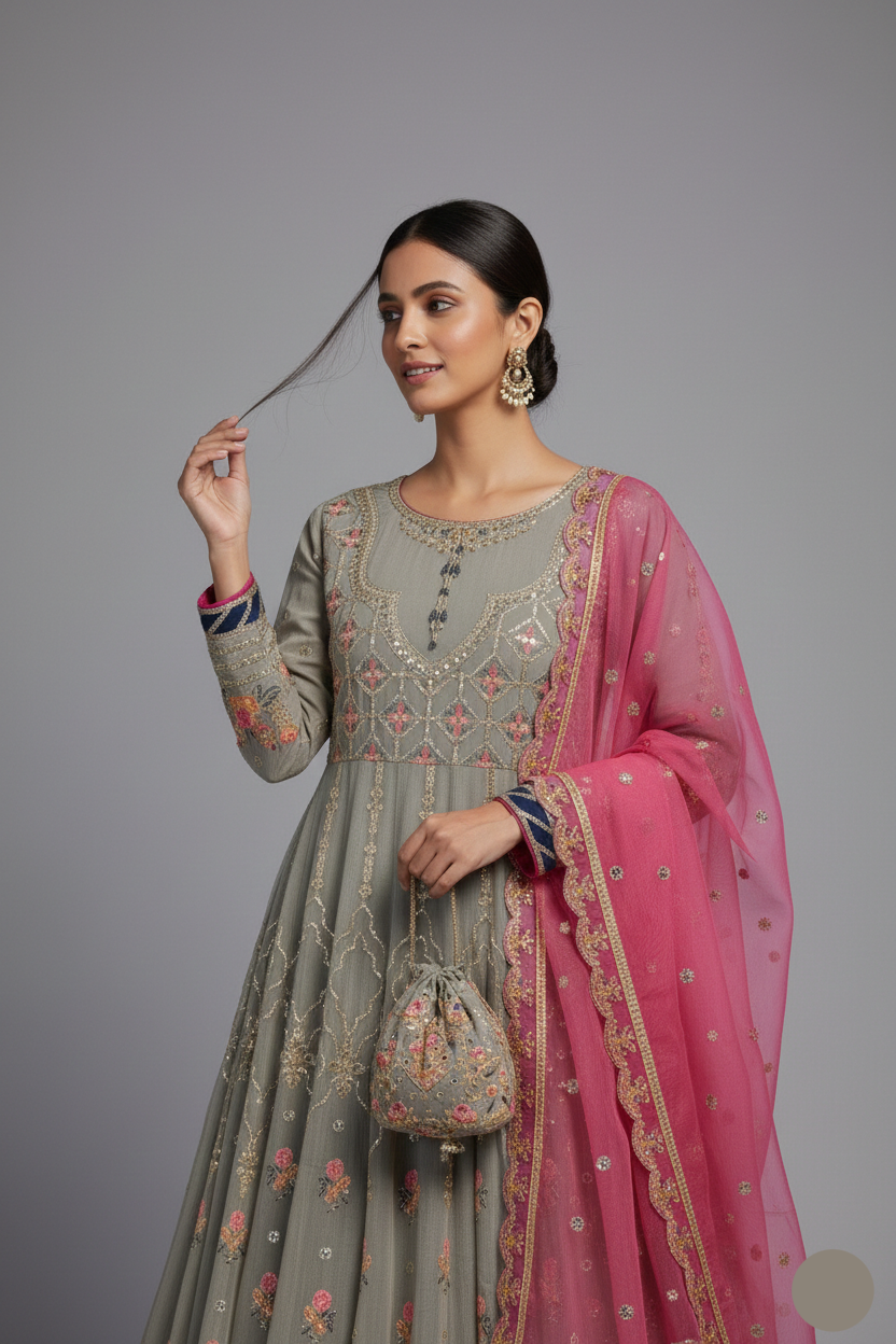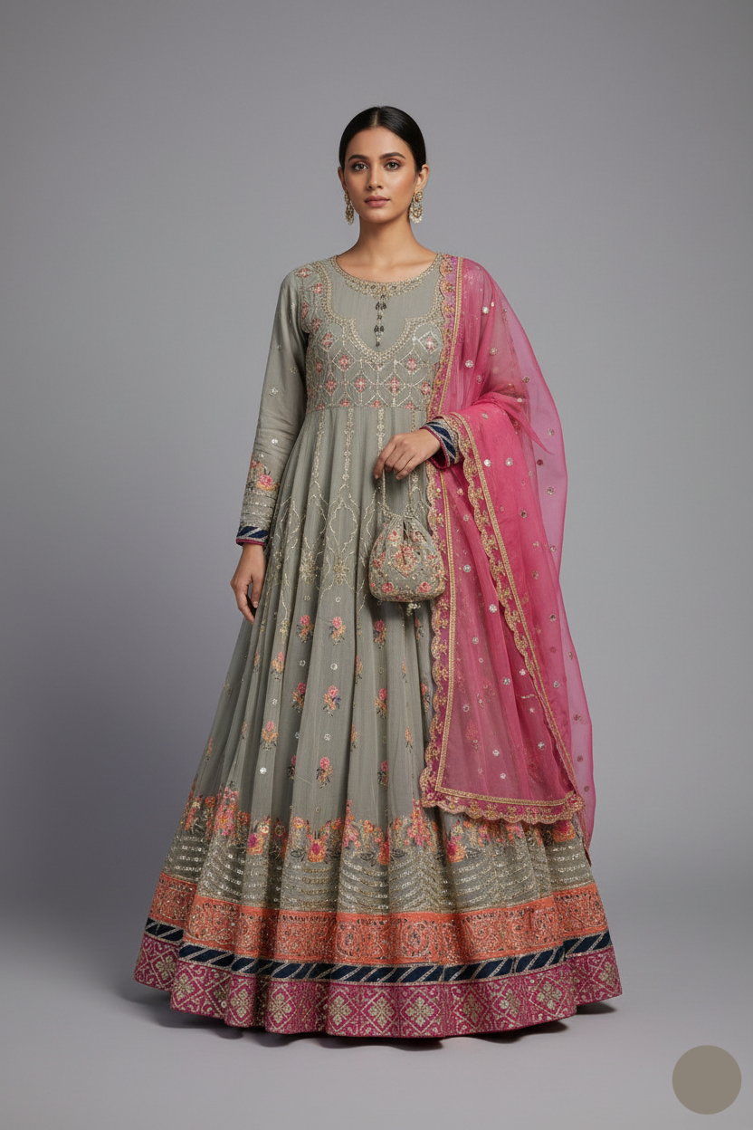 - The outfit features a long maxi made from chiffon fabric, paired with trousers crafted from grip fabric, and a dupatta made from masuri net fabric. The style of the ensemble is a long maxi, offering a flowing and elegant look. The maxi has a length of 57/59, providing a graceful and comfortable fit. The total weight of the outfit is 1.100 kg, making it lightweight and easy to wear. The combination of soft, flowing chiffon, structured grip fabric, and the delicate masuri net dupatta creates a perfect balance of sophistication and contemporary style, ideal for a chic and timeless appearance