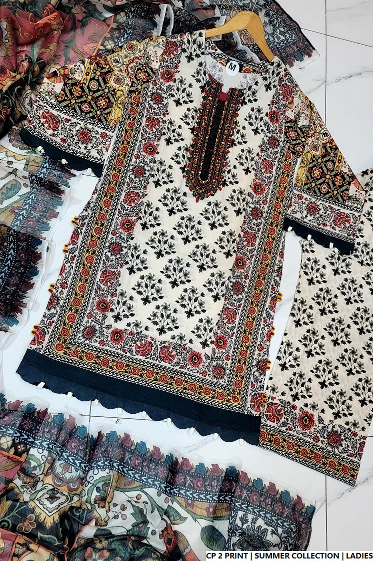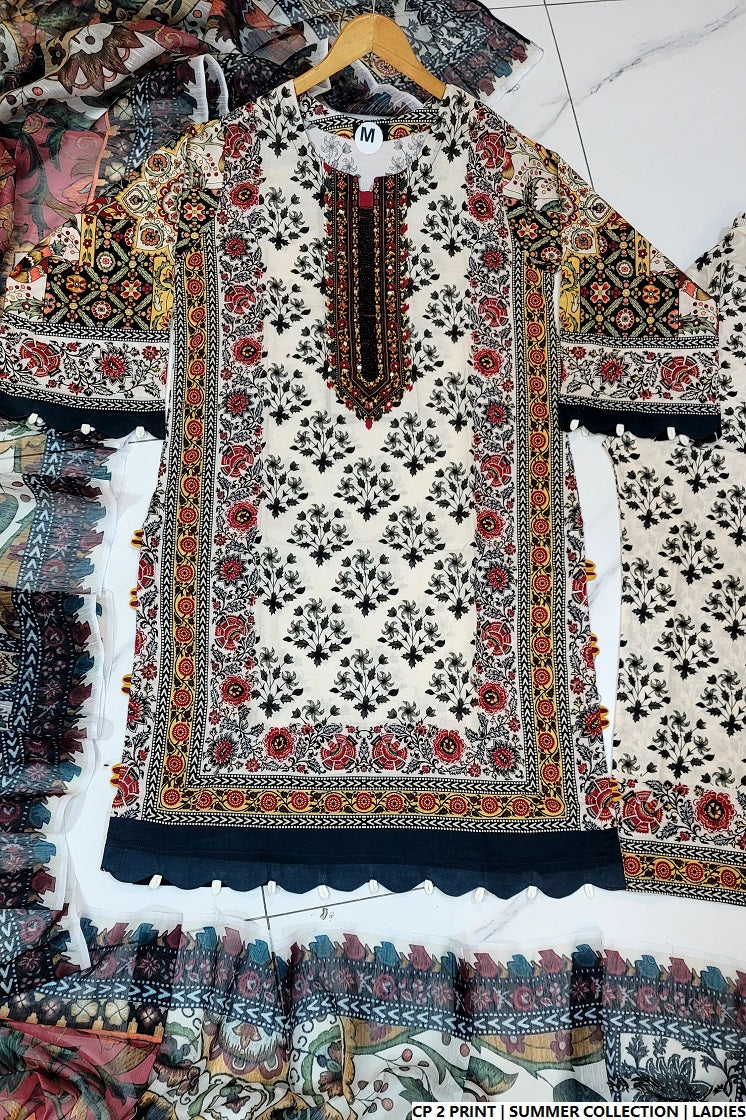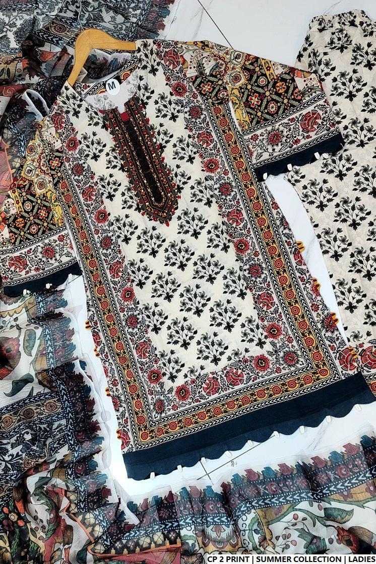 This chic 3-piece outfit is designed for comfort and style, featuring a straight shirt made from soft cotton fabric, perfectly paired with a matching cotton plazo for a graceful look. The shirt length ranges between 40 to 42 inches, providing a flattering fit for various body types. A digitally printed dupatta completes the ensemble, adding a modern and colorful flair. With a total weight of 0.500 kg, this outfit is ideal for warm weather and everyday elegance.
