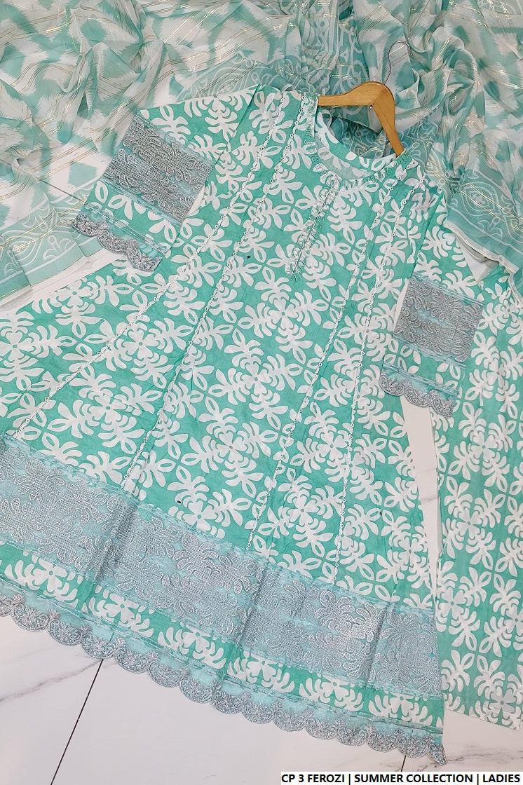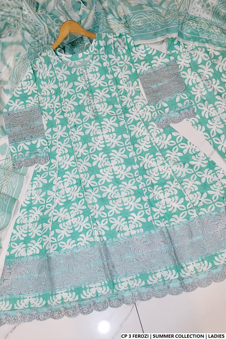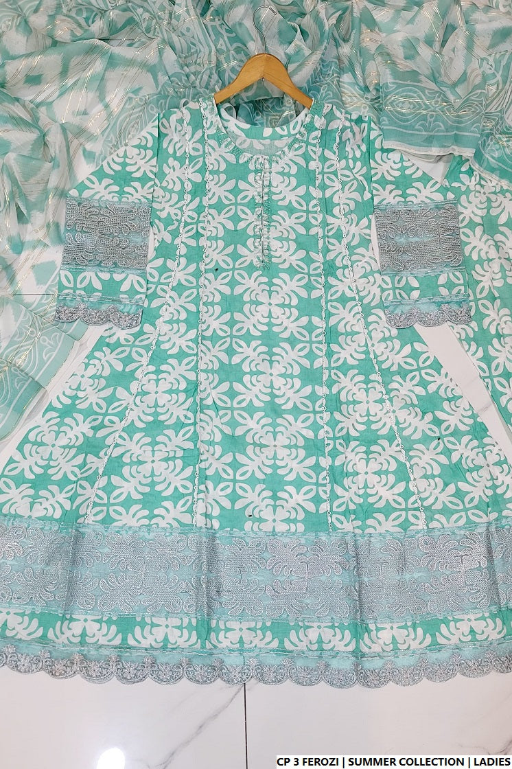 This beautifully designed 3-piece outfit features a long frock-style shirt crafted from breathable cotton fabric, offering a flowy and elegant silhouette. The shirt, measuring between 45 to 47 inches in length, pairs effortlessly with soft cotton trousers for comfort and grace. The digitally printed dupatta adds a vibrant and modern touch, completing the look. With a total weight of 0.550 kg, this outfit is perfect for seasonal wear, combining both comfort and charm for daily or semi-formal occasions.