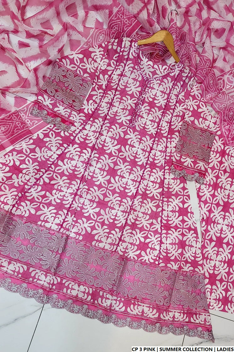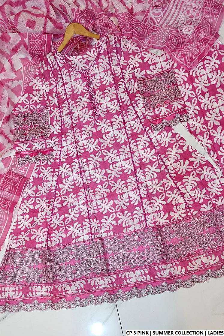 This beautifully designed 3-piece outfit features a long frock-style shirt crafted from breathable cotton fabric, offering a flowy and elegant silhouette. The shirt, measuring between 45 to 47 inches in length, pairs effortlessly with soft cotton trousers for comfort and grace. The digitally printed dupatta adds a vibrant and modern touch, completing the look. With a total weight of 0.550 kg, this outfit is perfect for seasonal wear, combining both comfort and charm for daily or semi-formal occasions.
